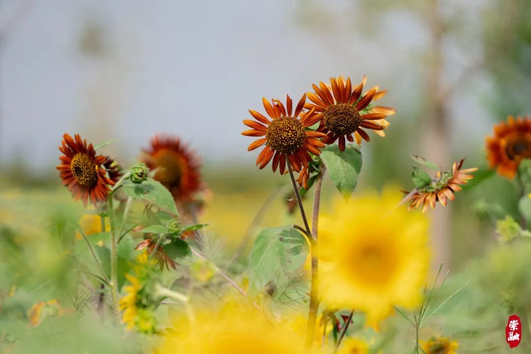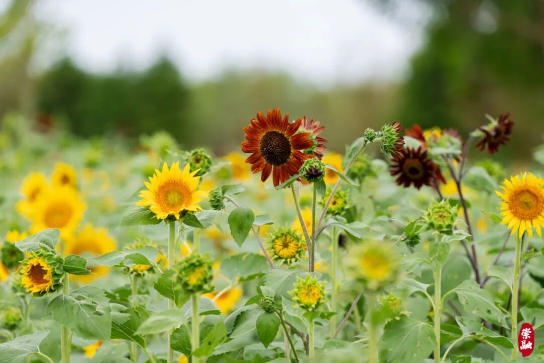 这茬向日葵是继春夏之后,栽种的第二茬向日葵,园区继续选取“油葵313”作为主要品种种植。该品种出苗稳定,花盘大而饱满,适合观赏。除此之外,这几天,园区引进的向日葵新品种,“波尔多红酒”也开始少量绽放,红色花盘格外醒目。