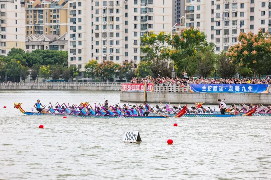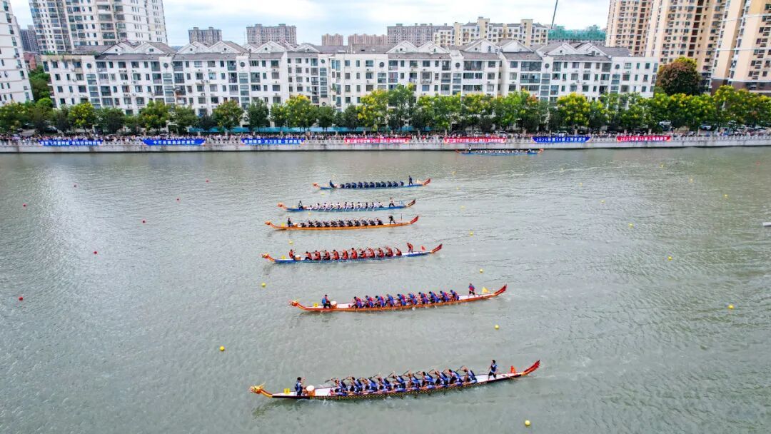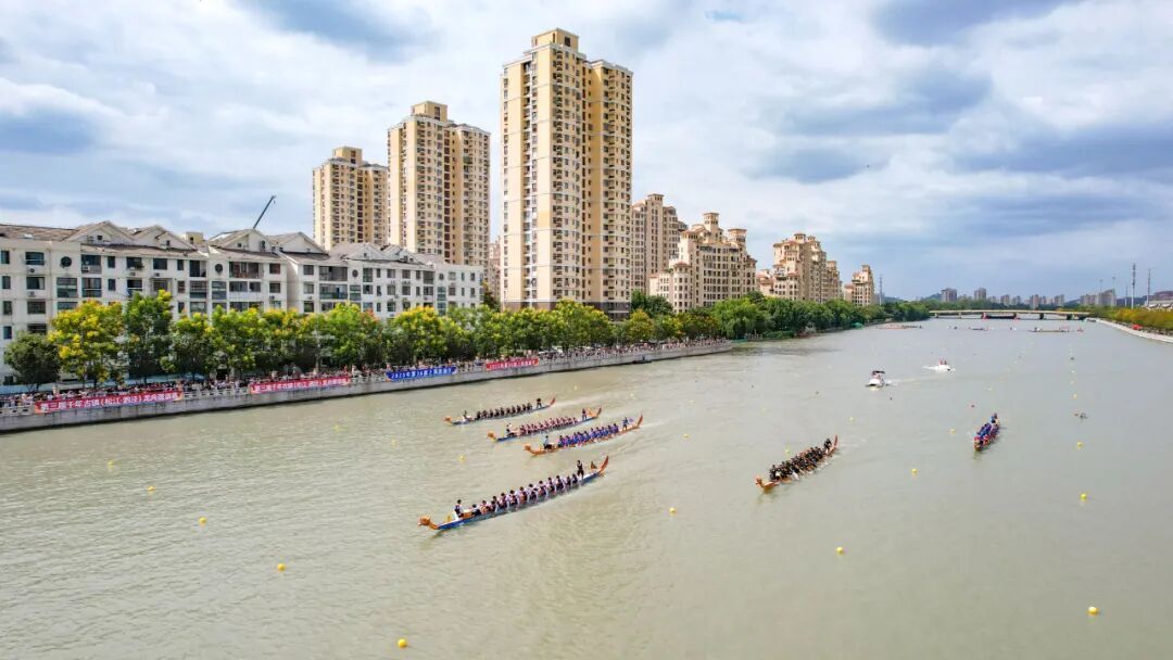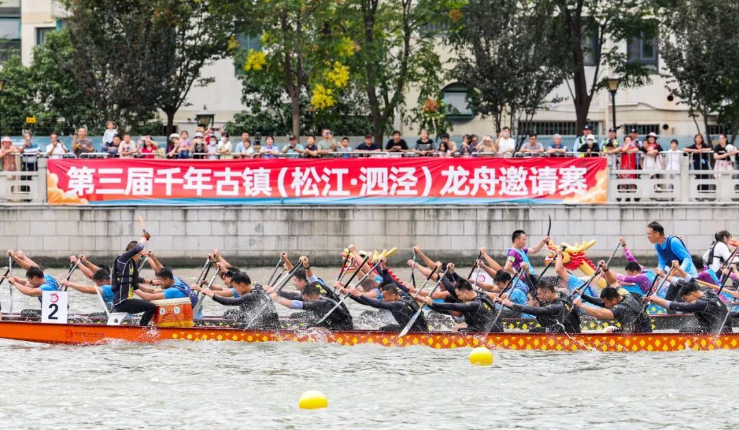 上午10时,半决赛正式开始,运动员们齐刷刷地挥桨划水,奋力向前。一艘艘龙舟如离弦之箭,在泗泾塘上留下道道波痕。一边是现代高楼,一边是市井古镇,在这片古韵浓厚的滨水空间奋楫逐浪,让参赛选手感受到了文化与体育的交融。
