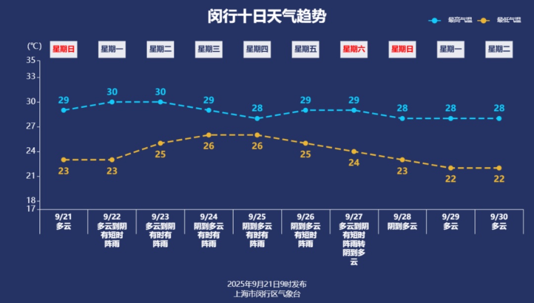今天天气可以给个好评。早晚透着丝丝凉爽,白天时而露出阳光,时而云层覆盖,没什么雨水打扰,东北风吹得舒畅。气温保持在温和的区间,全市最高气温27—29℃,徐家汇站28.6℃,舒适感在线。