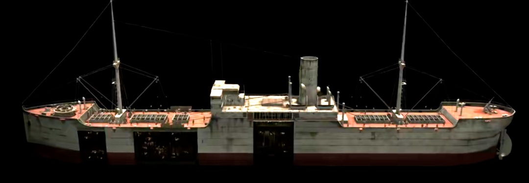 “里斯本丸”号尾部的螺旋桨此时已被鱼雷击毁,无法动弹,而海水从破损的船体涌入,很快就淹到了最靠近尾部的三号货舱。