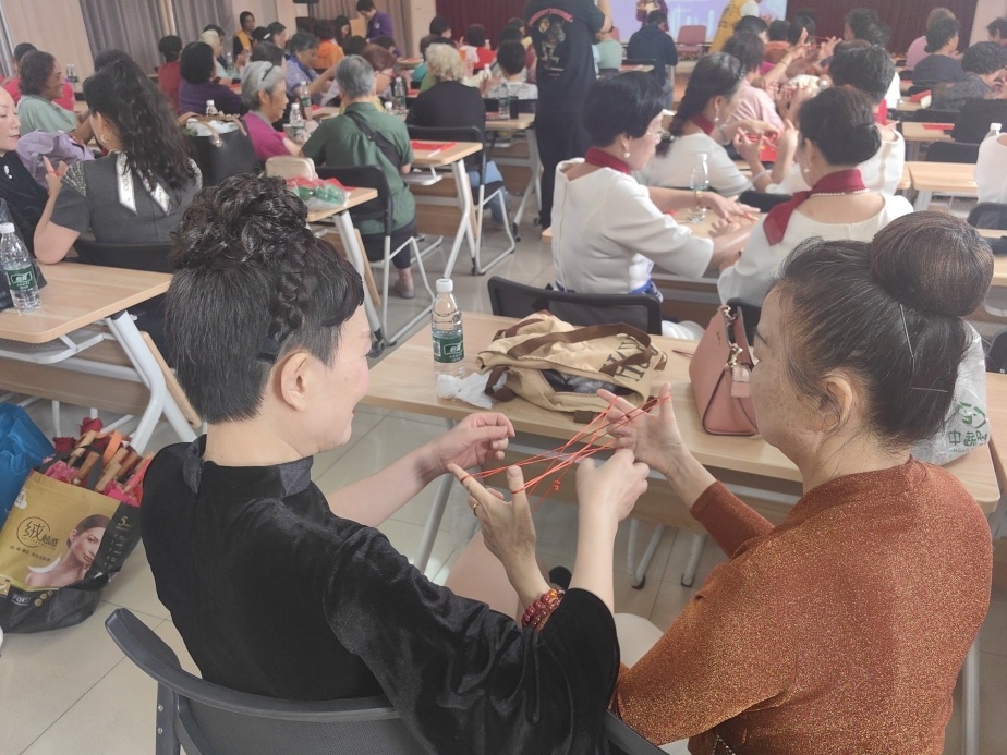 当天活动的最后一个环节,是“翻花绳”游戏。现场工作人员为在场老人发放了红绳,老人们则两两一组玩起了从小就熟悉的“翻花绳”。