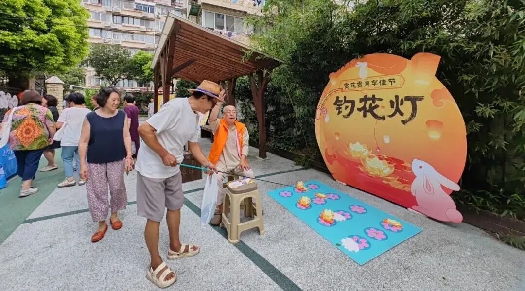 钓花灯、圈月饼、投中幸福等小游戏让社区老人跃跃欲试。爷叔手持特制钓竿,在志愿者的指挥声中,成功钓起莲花灯;坐在轮椅上的阿婆在女儿的鼓励下,扔出的套圈成功击中目标,笑得不亦乐乎。