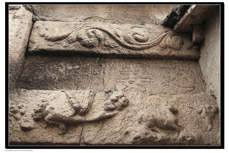 历史上,诸翟地区曾出现多座贞节牌坊,而留存至今的唯有位于诸翟西街75号处的“侯胡氏节妇坊”。《紫隄村志》记载:“侯节妇坊,在村西市居宅门首,康熙间为侯世谦妻胡氏建”。这座牌坊坐北面南,花岗石质,形制两柱一间无特殊安排。历经风雨侵袭,顶部的构架早已缺失。现存的牌坊柱高3.5米(始建时估计达5米左右),宽2.5米。石柱上有楹联,但字迹已漫漶。横枋石上浮雕瑞兽,夹堂石匾刻有“旌表侯益芝妻胡氏”8个字。
