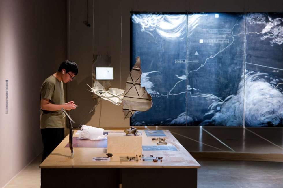 本次展览中,部分艺术家就通过回收火箭残骸,在经过无害化处理后,作为装置材料进行艺术创作。还有的艺术家将寻找火箭残骸的过程,提取为感知经验,例如将环境的声音、沙漠里的体感、发现时的坐标、从天而降的残骸与地面的植物和孢子实现了共生的奇妙状态,都融入创作之中。