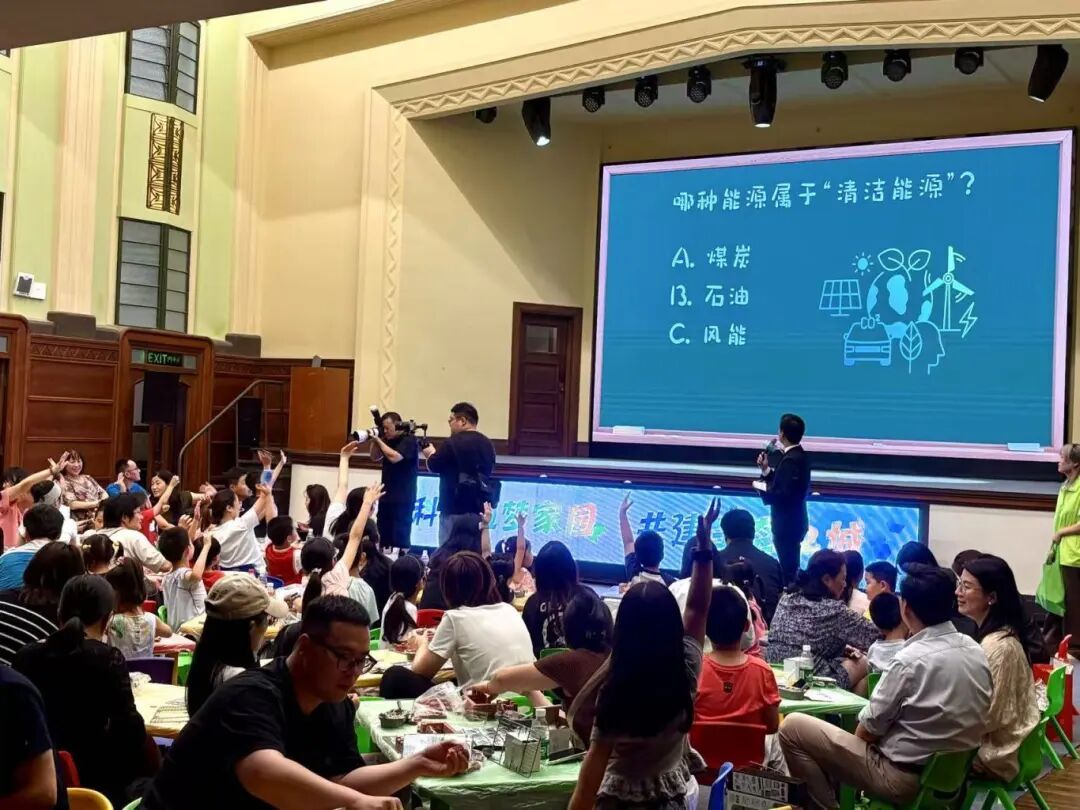 随后的绿色科技快问快答和垃圾分类闯关活动将现场气氛推向高潮。"我知道!我知道!"主持人话音刚落,一只只小手便争先恐后地高举起来。家长们都举起手机,记录下每一个精彩瞬间。