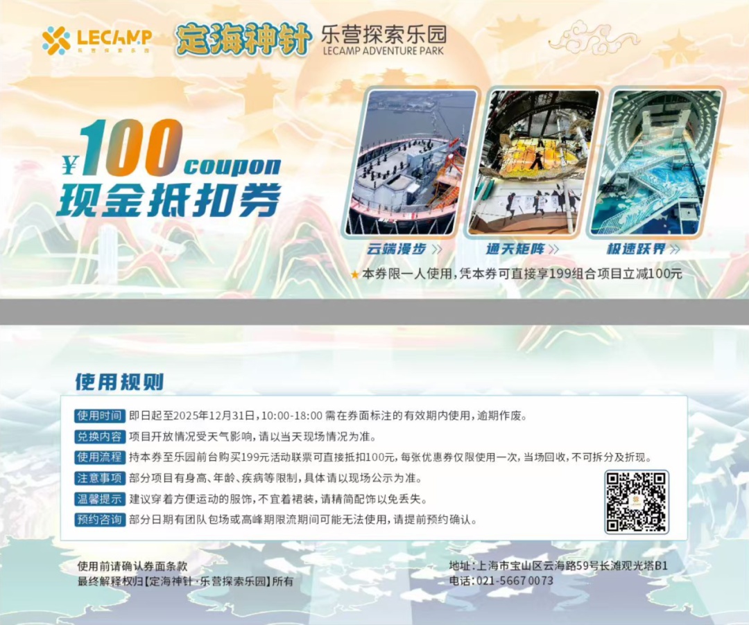 十一黄金周还在纠结去哪儿玩? 别犹豫! 上海国际邮轮旅游度假区 送福利啦! 持指定消费小票、船票凭证或2025年世界F1H2O摩托艇世锦赛中国上海大奖赛购票凭证,就能立即抽取定海神针乐营探索乐园100元现金抵扣券,假期游玩省钱又尽兴! 怎么参与 01 活动时间 即日起-10月8日 时间充足,别错过! 02 参与条件 持以下任意凭证即可参与,覆盖面超广! 消费凭证:即日起至10月8日,在上海·海上世界商场、邻江壹号国际邮轮酒店、全家(宝杨路二店)、壹棠服务公寓(上海·海上世界店)、上海伊敦康得思酒店、途易蓝邮轮港酒店(馥临门中餐厅)、灯塔营地、麦淘实验室、Manner咖啡(宝山滨江花园店)、米粒时空、一尺花园(矿坑花园店)的任意消费小票 船票凭证:2025年1月起所有从吴淞口国际邮轮港登船的邮轮船票 购票凭证:2025年世界F1H2O摩托艇世锦赛中国上海大奖赛购票凭证(点击购票) 03 参与步骤 3步搞定,超简单! 1、登录「上海国际邮轮旅游度假区」小程序; 2、上传消费小票/船票凭证/购票凭证(确保清晰完整); 3、立即抽奖(同一凭证重复上传无效)。 怎么兑换 01 核心要求 凭小程序中奖电子券到店换纸质抵扣券 02 兑换时间 2025年9月30日-10月8日 (覆盖黄金周,方便兑换) 03 兑换地点 宝山区云海路59号长滩观光塔B1乐园前台 (提前规划路线,别跑错) 04 使用须知 1、使用时间:即日起至2025年12月31日(每日10:00-18:00),需在券面有效期内用,逾期作废; 2、项目开放:受天气影响,以现场情况为准(出行前可查天气或咨询); 3、使用方式:买199元活动联票可抵100元(每张券限用1次,不拆分、不折现); 4、项目限制:部分项目有身高、年龄、疾病要求,以现场公示为准(带娃或有特殊情况者提前了解); 5、穿着建议:穿方便运动的服饰,少带配饰(避免游玩时不便或丢失); 6、预约咨询:部分日期可能包场或限流,使用前建议预约(咨询电话:021-56670073)。 重要提示 主办方将对上传凭证的真实性、有效性及是否符合活动规则(包括但不限于消费时间、商户范围及船票凭证要求等)进行严格审核。 若凭证经审核不符合要求,主办方有权取消相关用户的获奖资格,恕不另行通知。 十一假期,带家人朋友来上海国际邮轮旅游度假区,享美好时光,领超值福利!赶紧行动,把100元乐园抵扣券带回家,开启精彩游玩之旅! 更多优惠,敬请期待!
