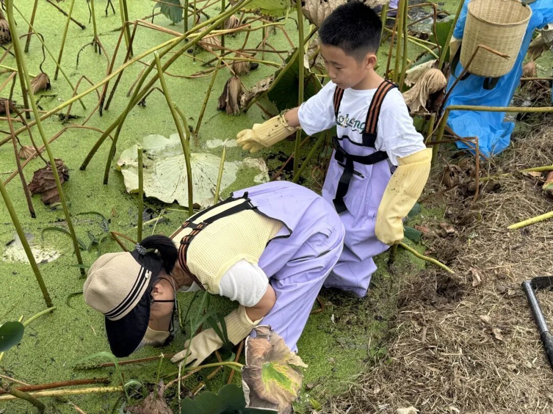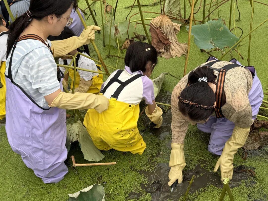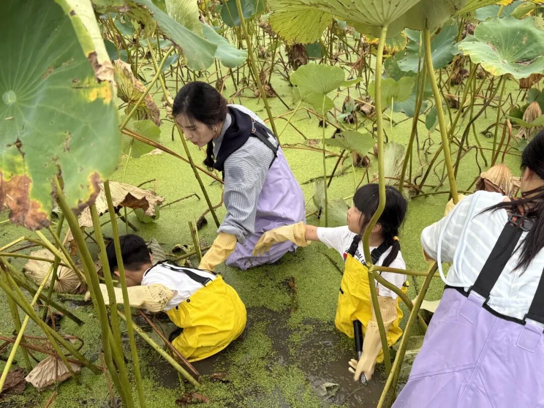 每当一根莲藕被挖出,现场便响起一阵欢呼。孩子们的脸上洋溢着收获的喜悦,家长们也在劳作中重温童年记忆。这场秋收实践,不仅让孩子们亲近自然,更让他们懂得“一分耕耘,一分收获”的道理。
