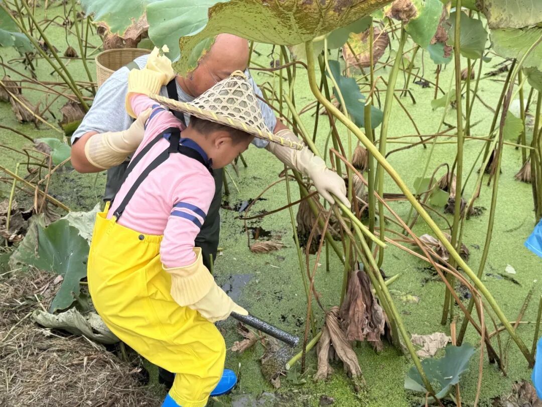 秋风送爽,渔墩村藕塘迎来了一片欢声笑语。孩子们挽起袖子、拿起锄头,在父母的陪伴和协助下,小心翼翼地在淤泥中探寻莲藕的踪迹。