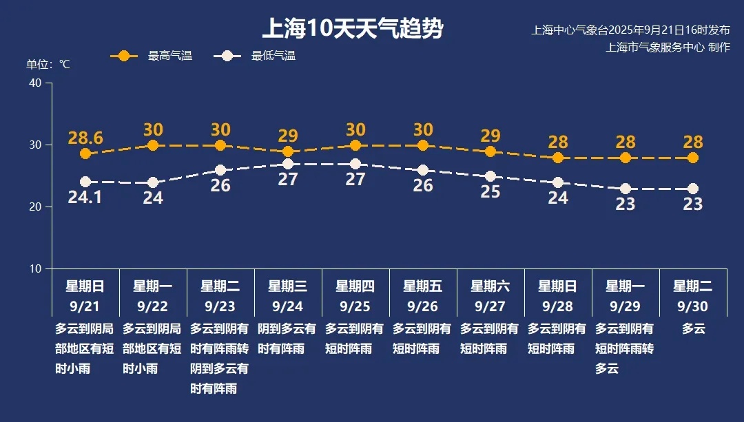 本周气温总体稳定,最高气温均在28~30度之间。周初上海依旧受偏东气流影响为主,天空云量多,伴随短时阵雨。周三前后受台风外围偏南急流和高空槽先后影响,可能将有一次明显降雨过程。台风路径和强度变化也会影响后期天气形势的调整更新,请及时关注最新的预报信息。