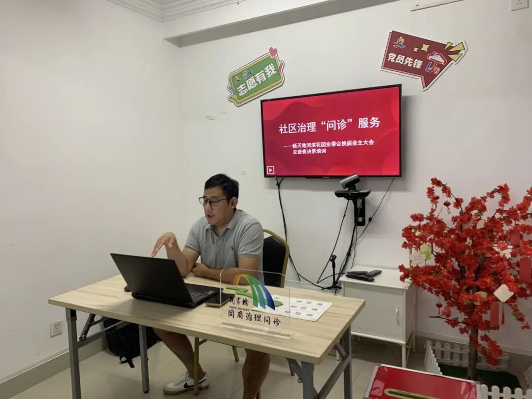 “小秘书”在新天地河滨花园小区现场接待,并就“如何组织召开业主大会会议”问题进行社区治理问诊