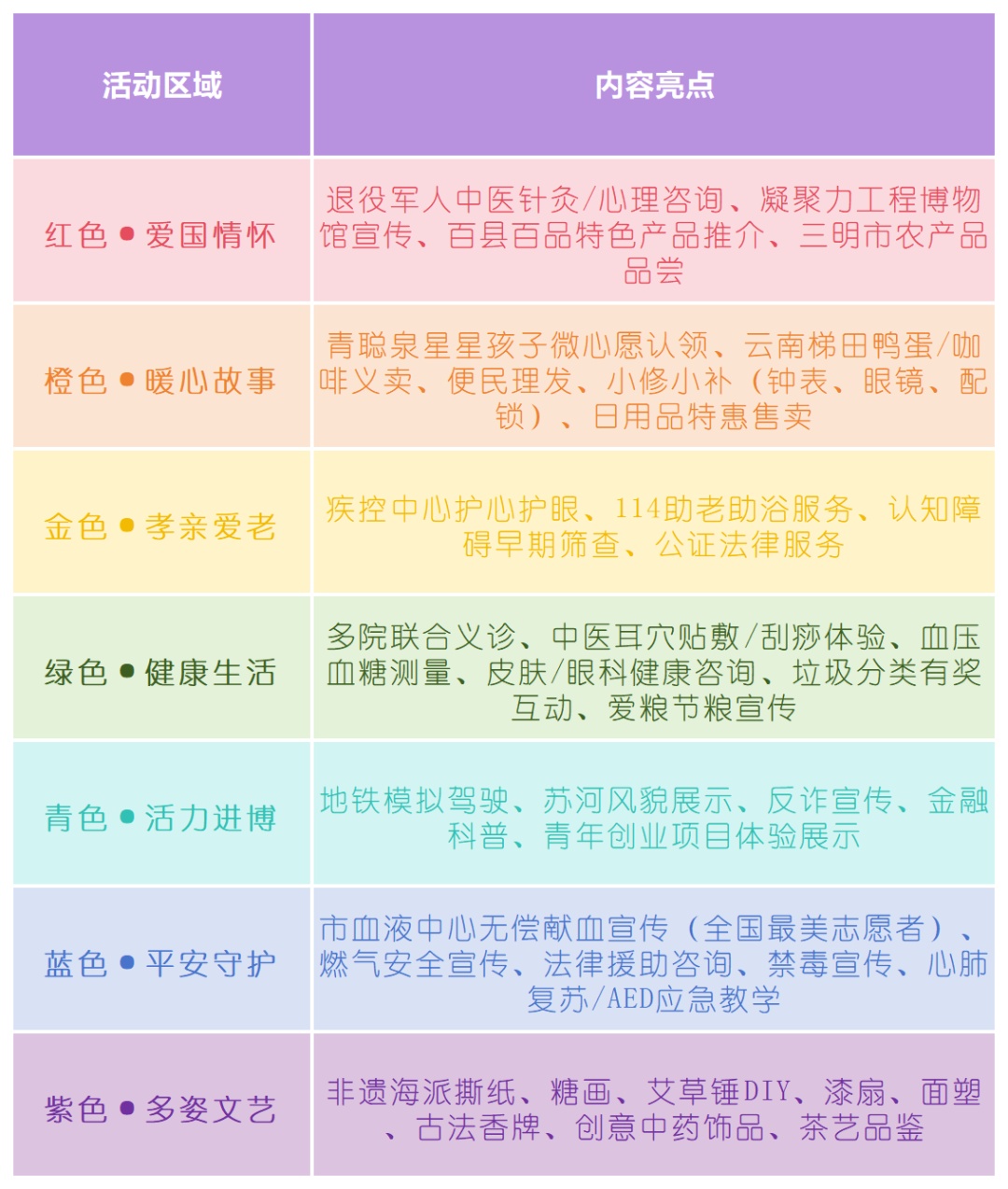 本次市集以“七彩”为脉络,划分七大主题区域,每个区域都藏着专属惊喜。健康守护、敬老服务、便民理发、小修小补、公益义卖、非遗体验、平安科普等,全领域服务打包体验!部分亮点抢先看↓↓↓