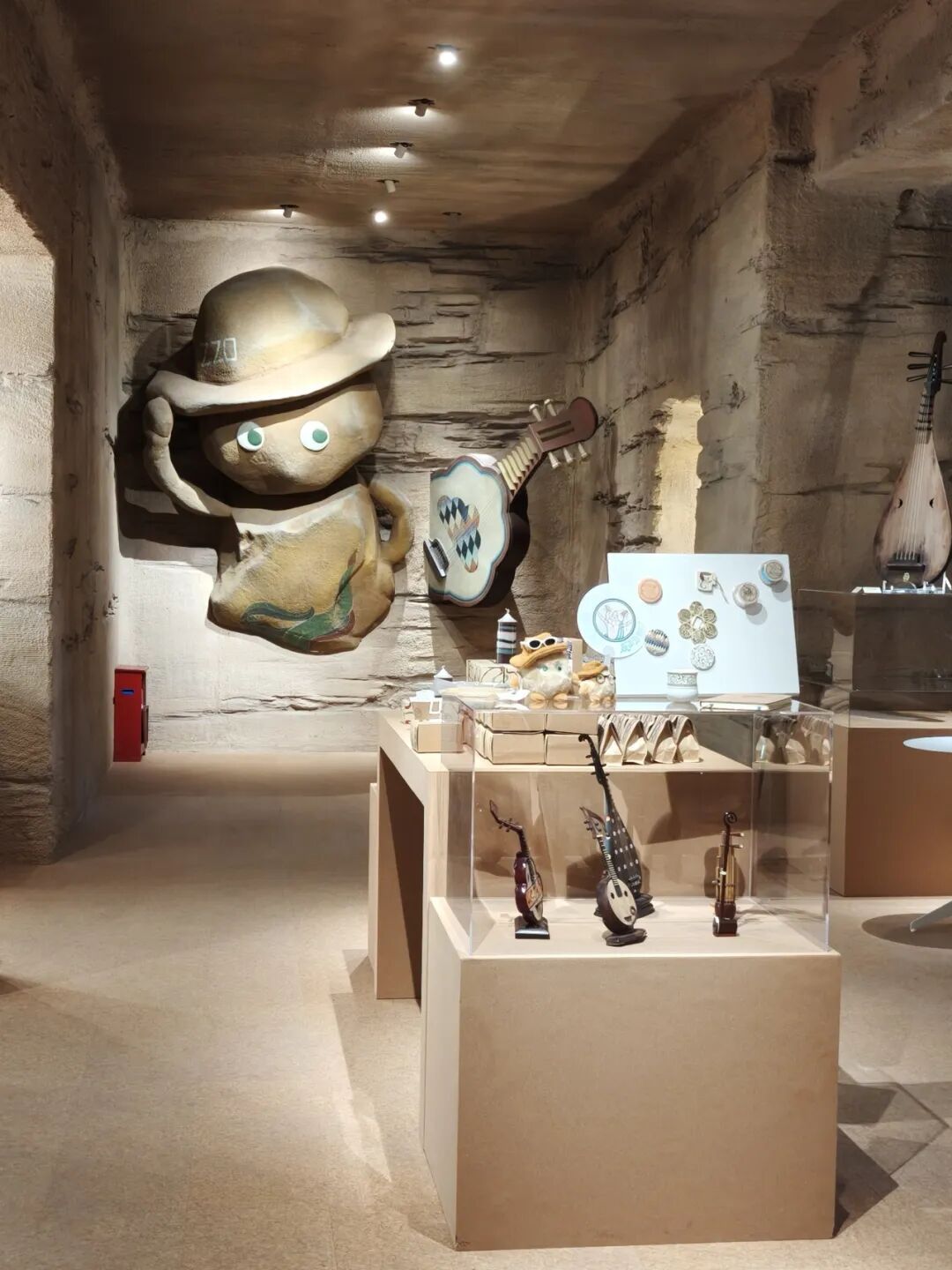 右手边的墙壁上,一位特别来宾憨态可掬——原创IP“石敦敦”以石头质感外形亮相,头戴小遮阳帽,手执出自莫高窟220窟的“莲花阮”,敦煌风拉满。