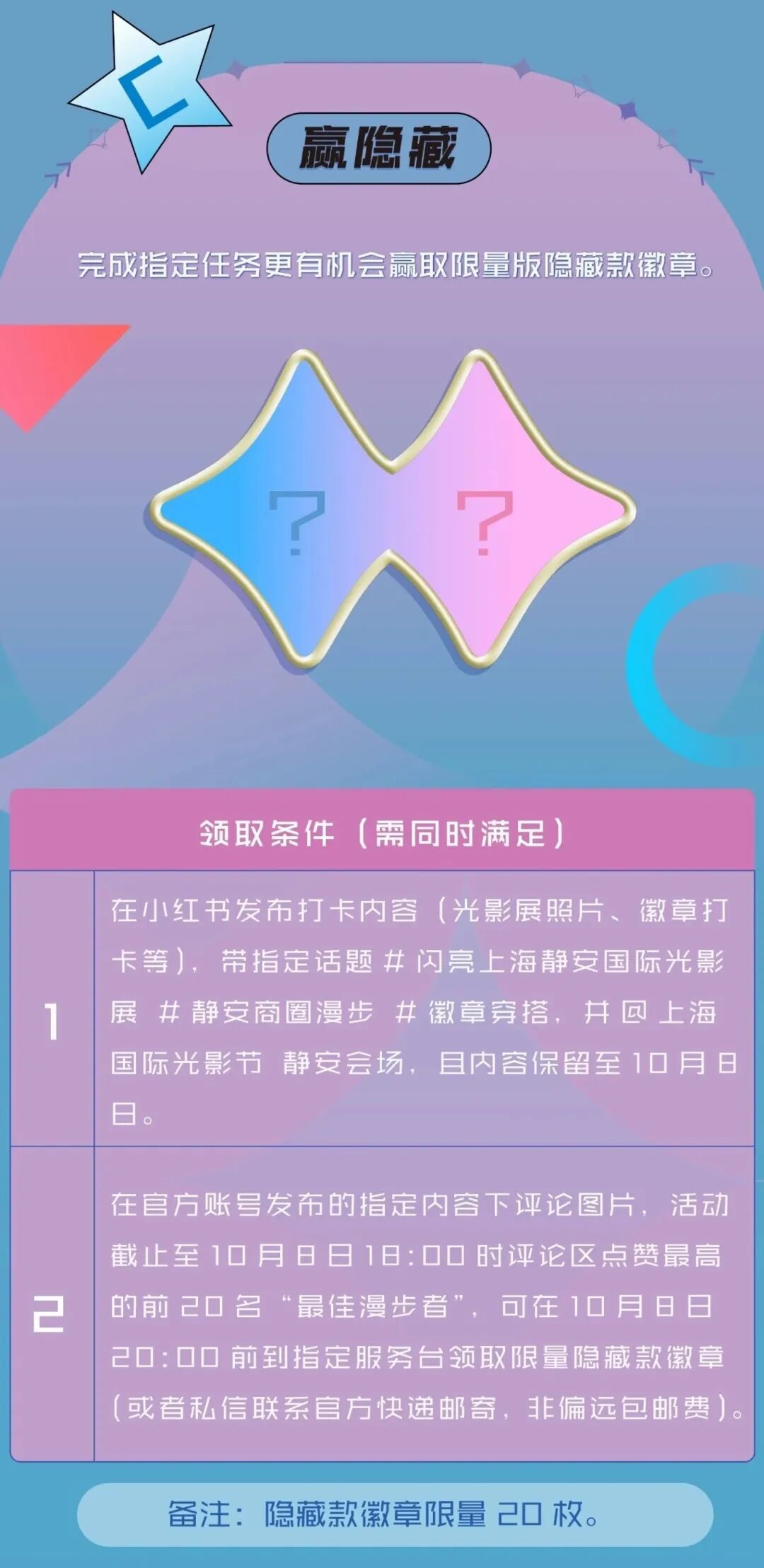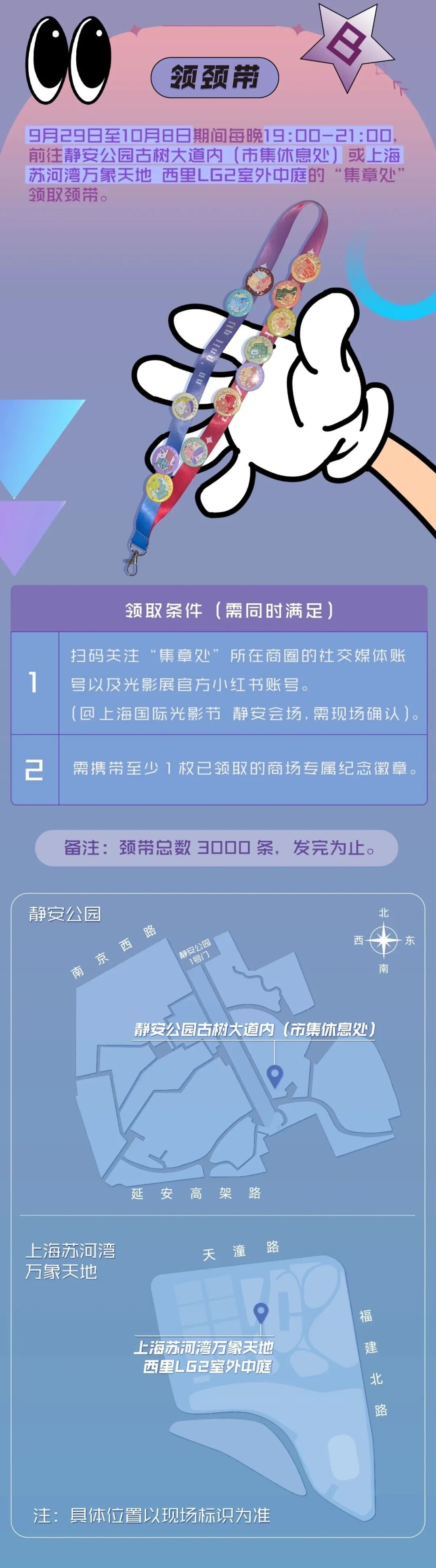 关注官方小红书账号@上海国际光影节 静安会场,并至少携带一枚徽章前往静安公园、苏河湾“集章点”,即可领取“漫游颈带”一条。