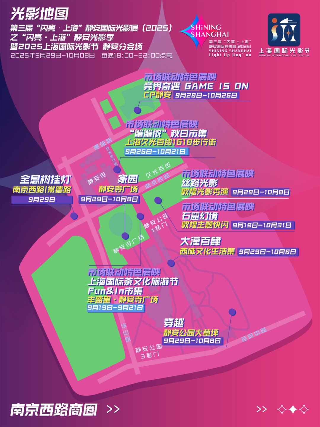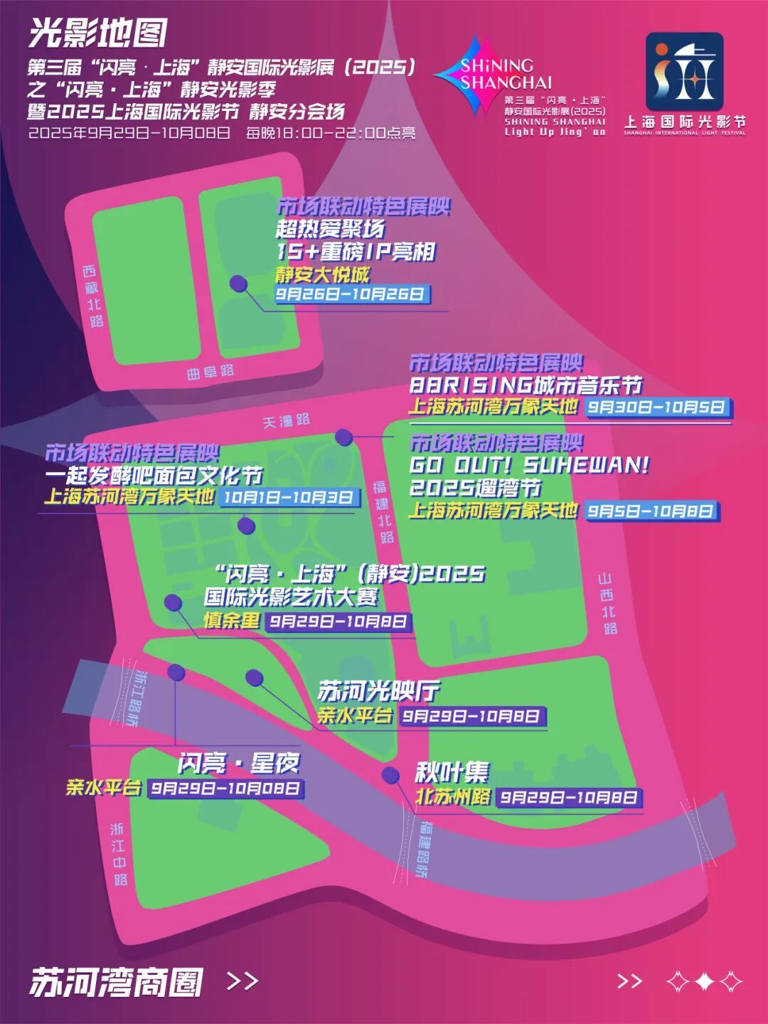 更多精彩的光影点位与深度剧透、联动玩法,我们将陆续为大家带来抢鲜看!无论你是艺术爱好者还是时尚购物达人,都将在第三届“闪亮·上海”静安国际光影展(2025)之“闪亮·上海 静安光影季”中找到属于自己的心动时刻,从南京西路到苏河湾,多个光影艺术点位正串联起一张贯穿城市脉络的“光语地图”。