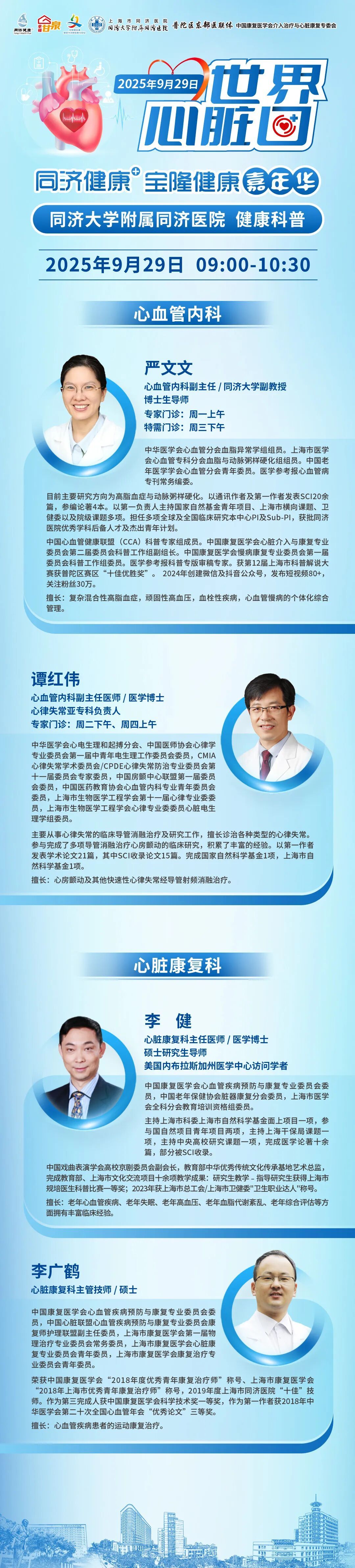 每年的9月29日是“世界心脏日”,是世界心脏联盟发起的一项全球性健康倡议,旨在提醒每一个人:心脏健康,是生命活力的源泉,更是平凡生活中最值得珍视的礼物。它不只关乎疾病与治疗,更关乎如何更好地生活、更深情地去爱、更长久地陪伴。 心之所向,守护相随——与心脏专家相约一场温暖的健康对话 值此世界心脏日,上海市同济医院心血管内科与心脏康复科的四位专家强强联合,教你用科学“拆弹”血管危机,守护生命引擎!不制造焦虑,只分享真正有用、有温度的心脏守护知识。