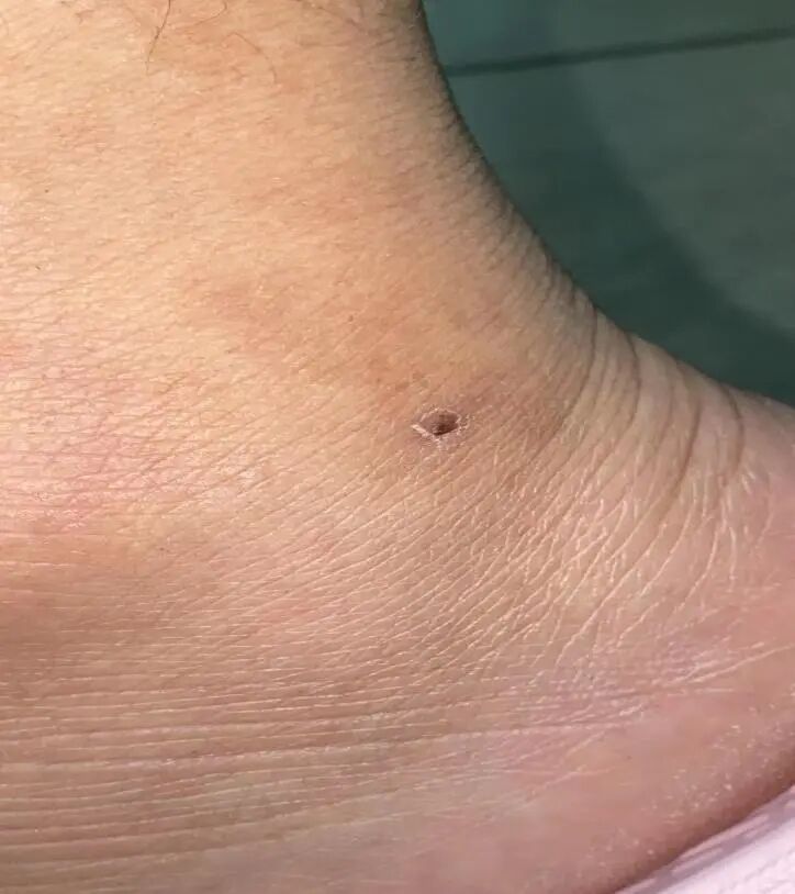 倪主任和床位医生来到患者床边,再次询问病史,并做了全身的仔细查体,终于在患者右踝关节上方找个一个不起眼的皮疹,中央为绿豆大小的黑色皮损,周围伴有脱屑皮疹,但患者本人已记不清是否曾有过昆虫叮咬史,也没有明显的瘙痒、疼痛症状。尽管这个皮疹不太符合恙虫病典型的焦痂样皮疹表现,但有了一丝线索,仿佛在迷雾之中看见一丝光线。