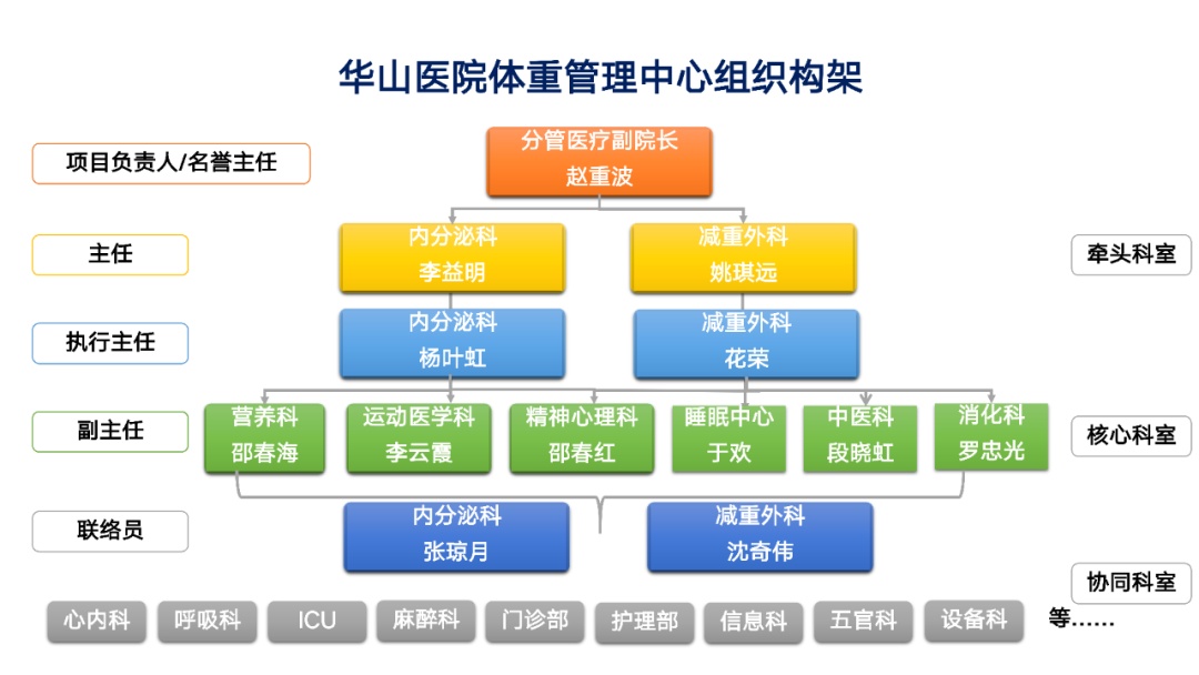 华山医院积极落实《“健康中国2030”规划纲要》和《“体重管理年”活动实施方案》,于2024年成立华山医院体重管理中心。中心现由华山医院赵重波教授担任负责人,协同整合内分泌科、普外科肥胖疝外科中心、运动医学科、临床营养科、精神医学科、神经内科睡眠中心、消化科、麻醉科、超声医学科、护理部、心内科、血液科、呼吸科、大数据中心、门诊部、泌尿外科、风湿科、皮肤科、全科医学科、放射科、重症医学科等多学科资源。
