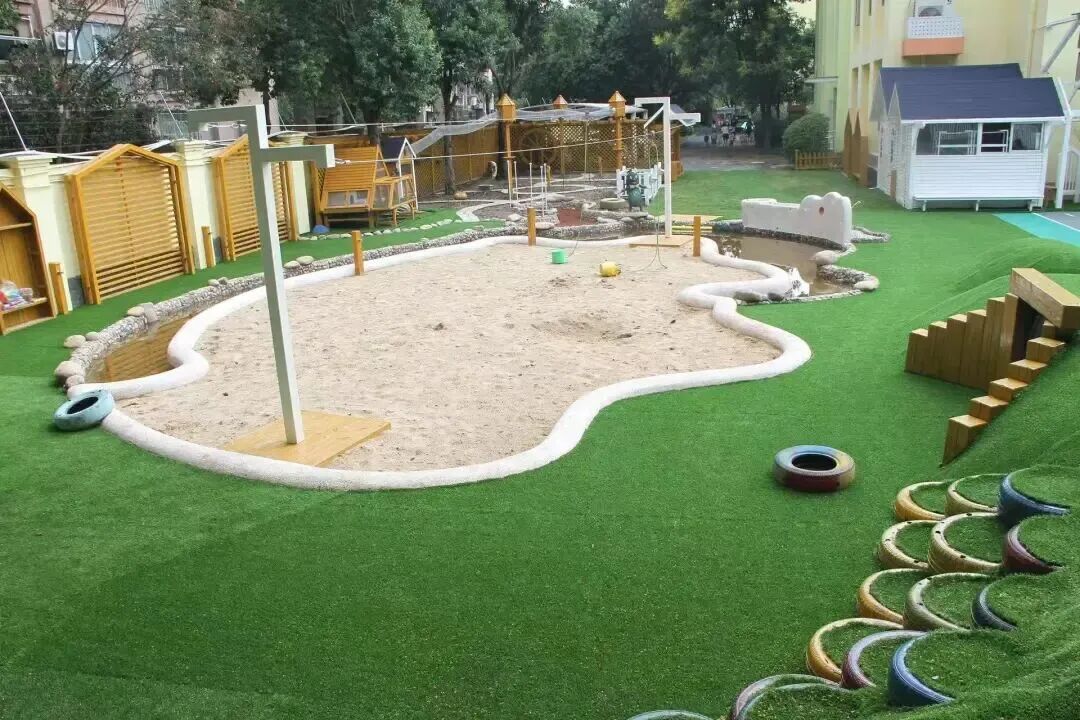 环形布局的玩沙区里,四角的水龙头方便孩子们随时取水开展沙水游戏,中间新增的运输轨道让创意玩法更丰富。