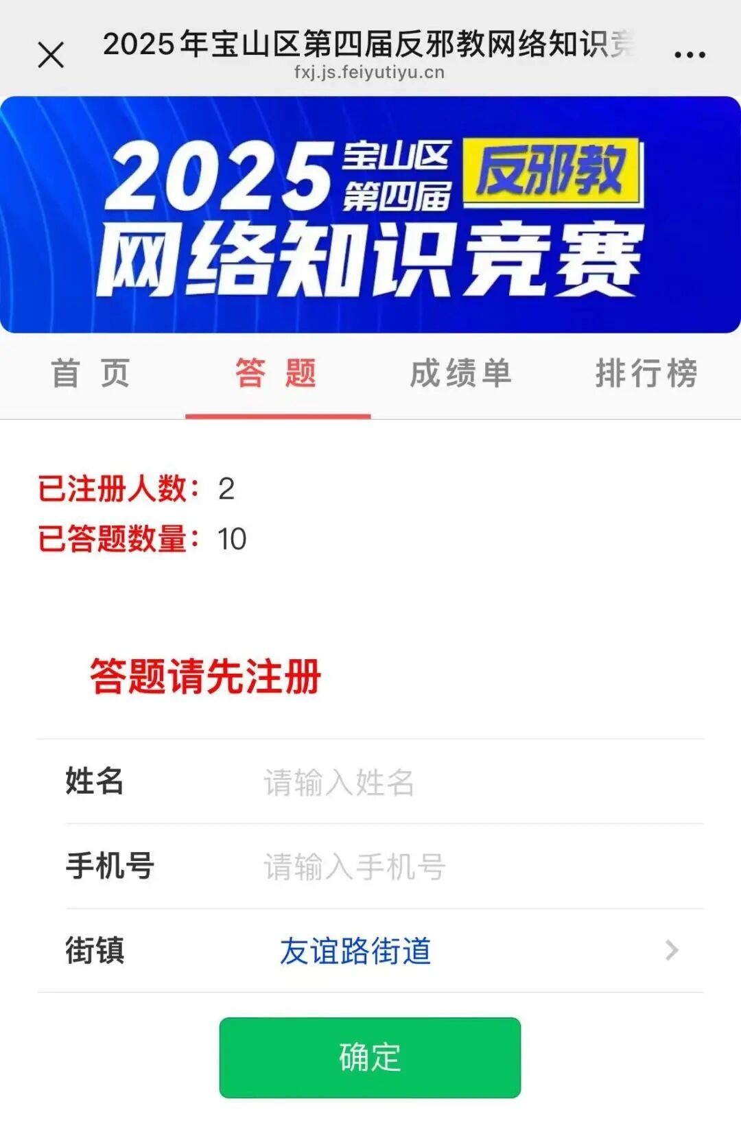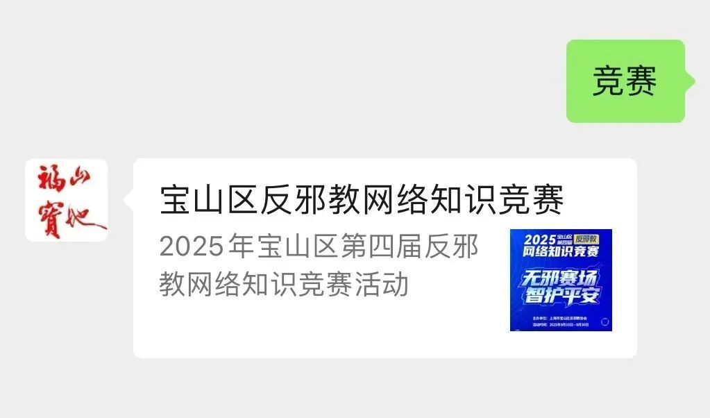1.关注注册:关注“福山宝地”微信公众号,发送“竞赛”获取答题入口,注册完成后进入“反邪教网络知识竞赛”答题页面。