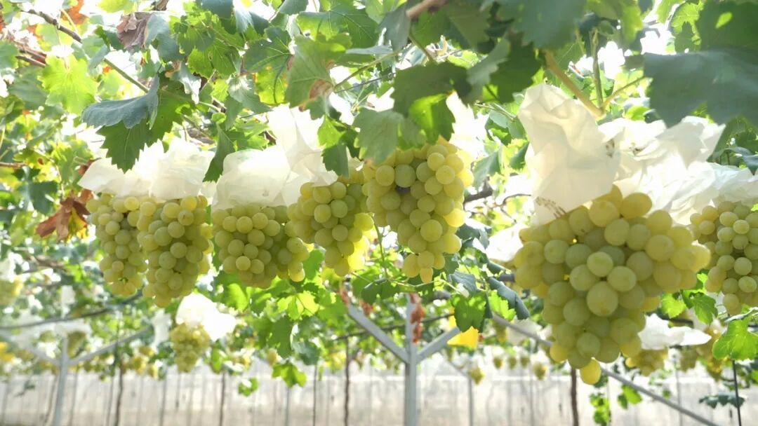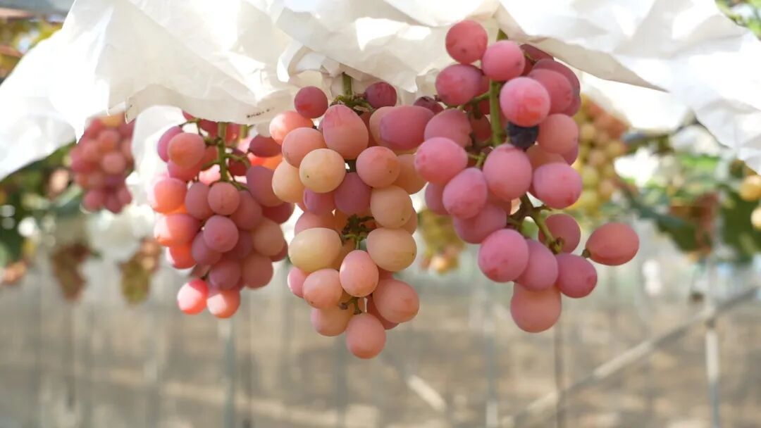 “今年我们吸取了往年的经验,通过降低产量、控制穗重、铺设反光膜等措施,让葡萄的着色更好,看起来更加粉嫩诱人。”王素青说。