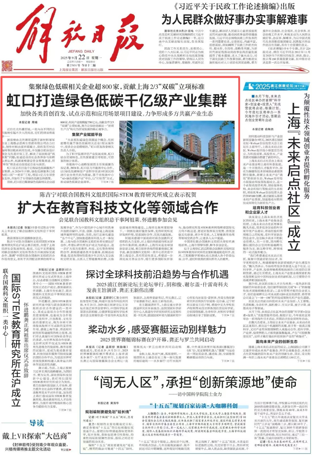 9月22日,解放日报头版头条刊发《虹口打造绿色低碳千亿级产业集群》,报道虹口区集聚绿色低碳产业赋能平台、“磁吸效应”持续放大,力争形成多方共赢产业生态,努力让绿色低碳这一“新质生产力”转化为区域发展的核心竞争力。