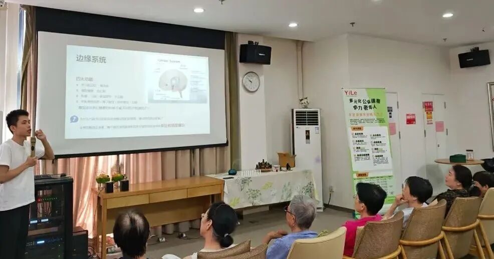 活动伊始,在有关认知障碍宣传片的故事当中,一场关于“认知障碍”与“芳香疗法”相结合的健康之旅正式开启。本次活动特别邀请了国家高级精油康复理疗师、德国TUV莱茵认证精油调理师许明亮老师授课。许老师通过课件展示了包括阿尔茨海默病的早期症状、预防重要性以及芳香疗法的积极作用等,为现场的居民们科普了知识,提升了自我脑健康保健的管理意识。