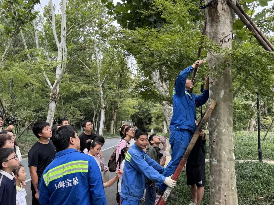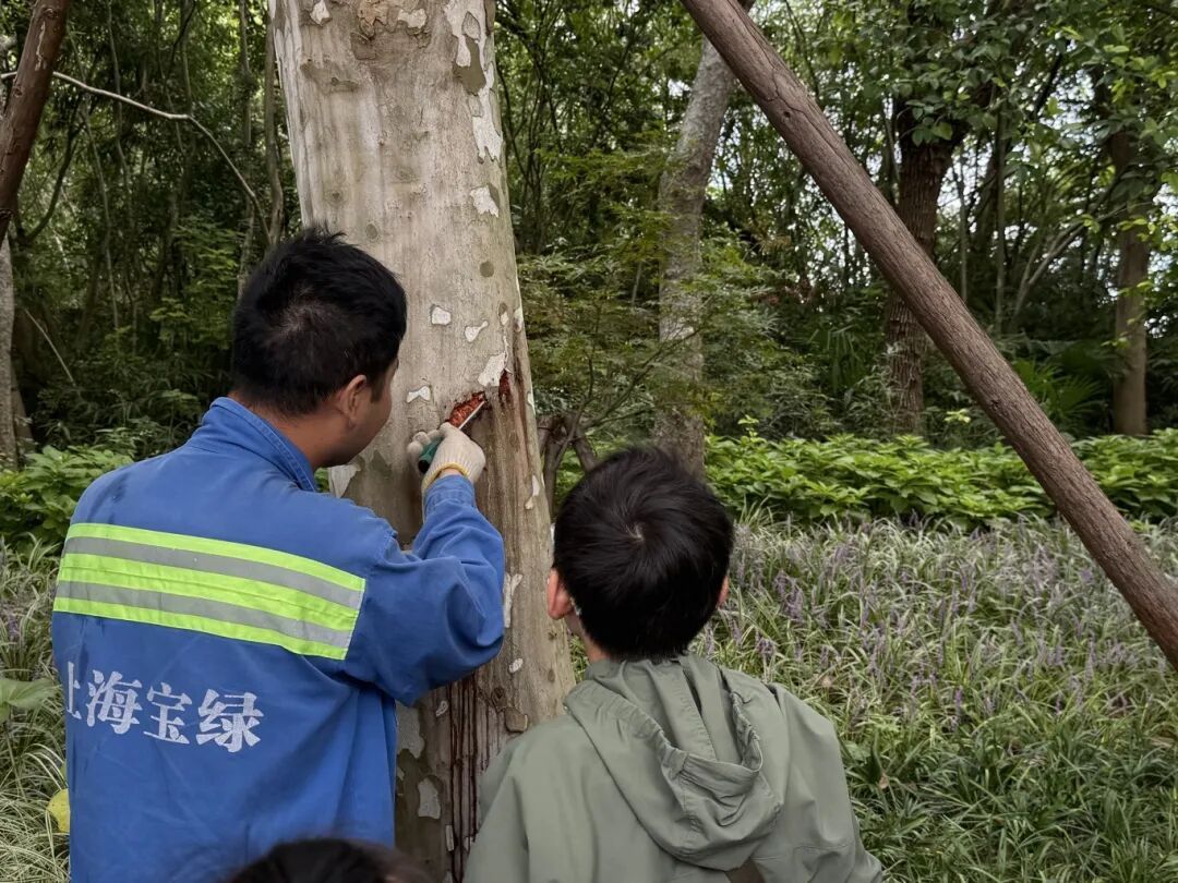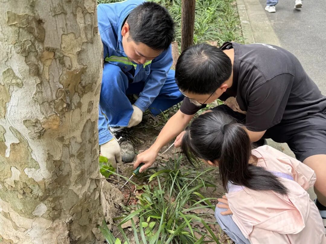 天牛防治实地演示环节更让参与者直呼“涨知识”。大家跟随工作人员参观公园内的昆虫诱捕装置,了解其工作原理与布设逻辑;工作人员现场演示天牛防治全流程,从辨认树皮上的危害痕迹,到用专用工具钩杀幼虫、精准注药,每一步操作都配合细致讲解。“原来不用靠大量农药,也能守护树木!”活动参与者感慨道,“这种实地教学比看书更直观,我回去也要把这些生态防治方法分享给社区的园艺爱好者。”