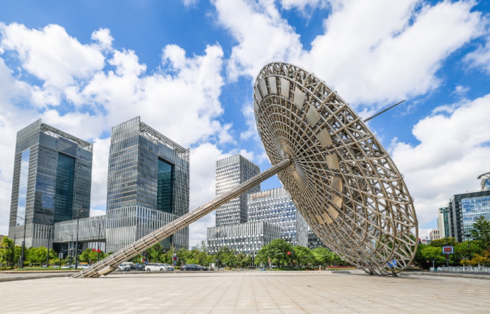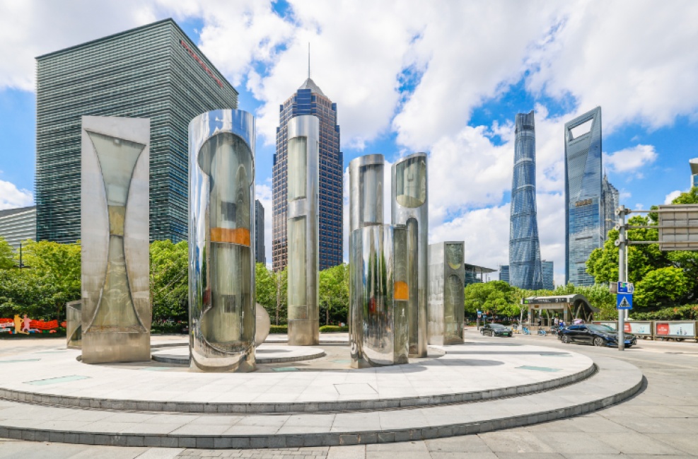 在世纪大道与崂山西路的交汇处,则竖立起一组大型城市公共景观艺术装置《世纪辰光》。它以中国古计时器“沙漏”为原形,作品别出心裁地由9根高低不一、最高为13.2米的不锈钢镶玻璃的立柱,呈抛物线分布。每隔2至5天,底下的电泵就会把漏掉的沙再打上去,如此周而复始,成为古代智慧与现代科技的完美结合体。