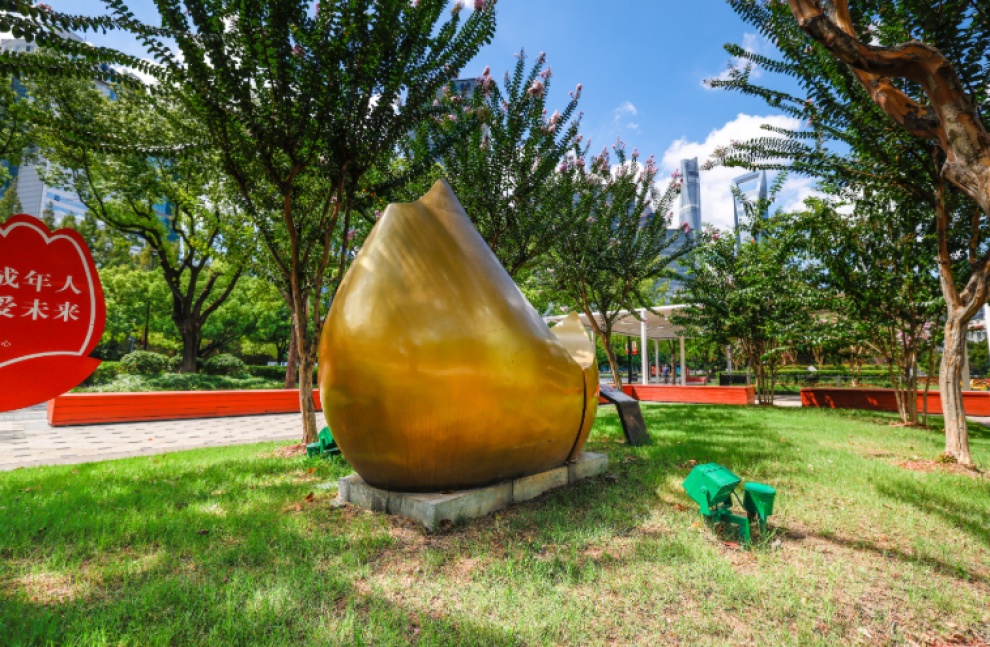 “逸飞说:‘因为世纪大道是西方人设计的,所以我要把东方元素放进去!’”胡炜回忆道。因此,在世纪大道紫蔚园中,就有了陈逸飞引以为傲的组雕《五行》。雕塑以金、木、水、火、土五个甲骨文字造型为基本设计元素,造型形象各异。其创意源自中国古代相生相胜的哲学思想,世界万物由此运动发展,循环往复,以至无穷。