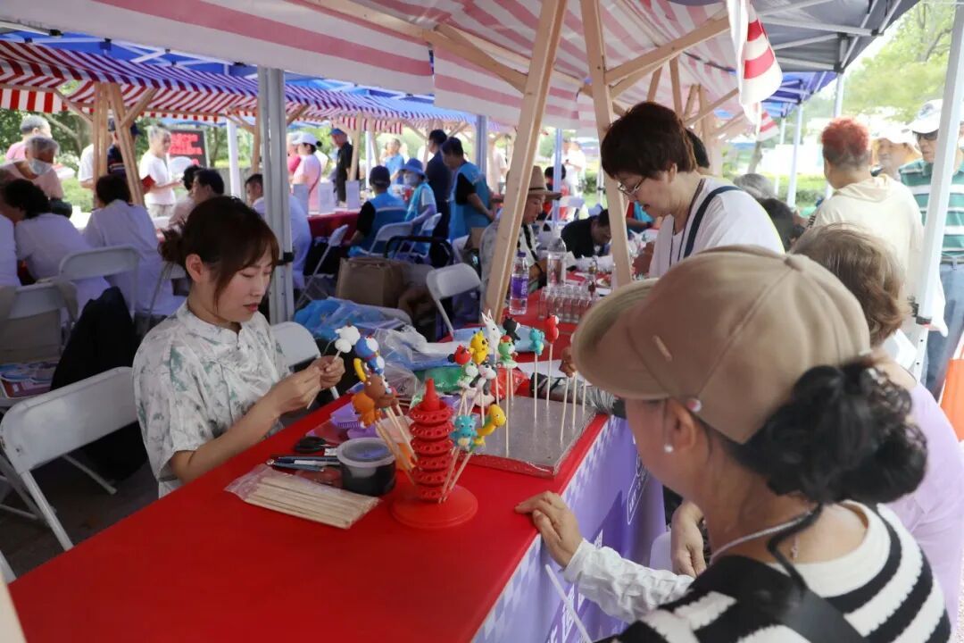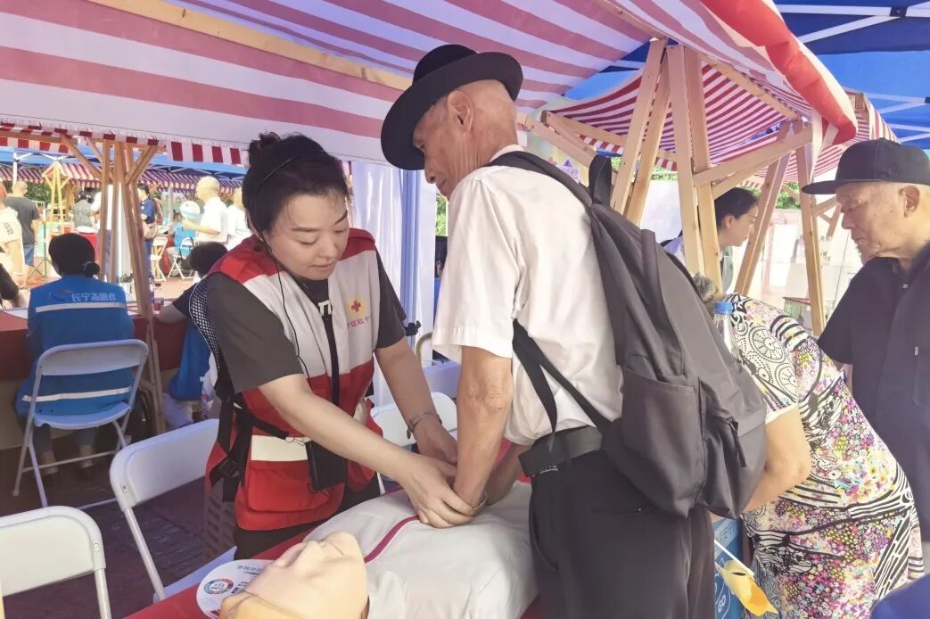红色·爱国情怀区里,退役军人中医针灸义诊摊位前排起长队;上海凝聚力工程博物馆的宣传展板前围满驻足聆听的市民,百县百品特色产品与三明市农产品让大家在品尝美味的同时,感受帮扶情谊;橙色·暖心故事区十分热闹,青聪泉“星星孩子”的微心愿卡片被纷纷认领,便民理发椅前坐满等待的居民,钟表维修、眼镜调整、配锁等“小修小补”服务,细致解决生活难题;蓝色·平安守护区里,上海市血液中心摊位前,工作人员热情讲解无偿献血知识,心肺复苏教学、燃气安全宣传等摊位吸引不少市民驻足咨询。金色·孝亲爱老区的护心护眼咨询、认知障碍筛查,绿色·健康生活区的多院联合义诊、中医耳穴贴敷体验,青色·活力进博区的青年创业项目展示、金融科普,紫色·多姿文艺区的非遗海派撕纸、糖画制作、漆扇DIY——每个摊位前都涌动着人潮,每一次互动都传递着“志愿长宁”的温度。