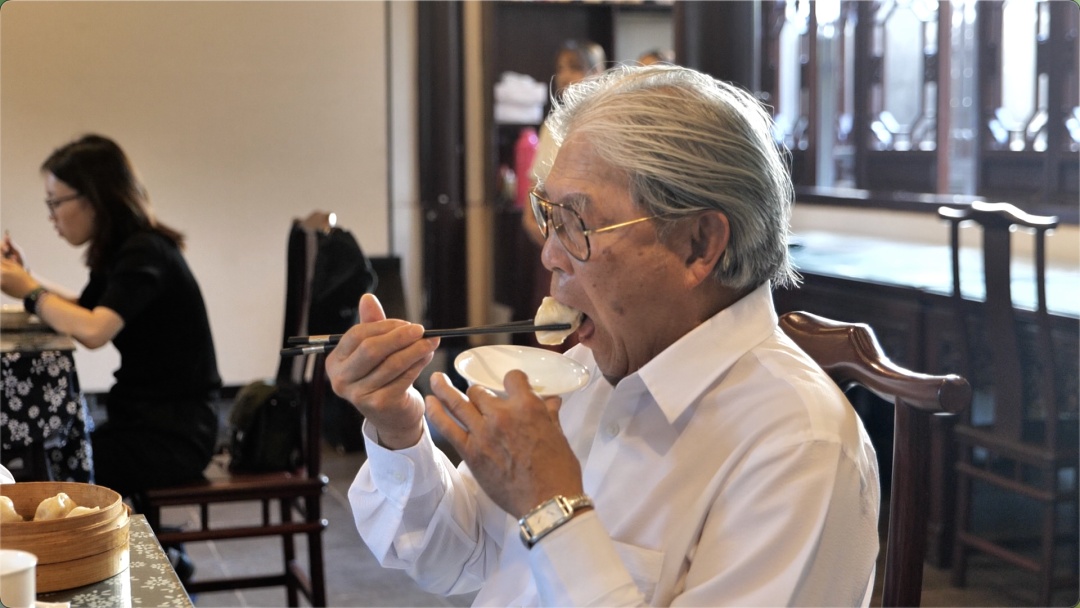 “刚出炉的南翔小笼来咯……”伴随着店家的吆喝声,一屉屉热气腾腾的小笼被端上桌,霍震霆欣然落座八仙桌,和大家一同品尝这道闻名遐迩的江南美味。