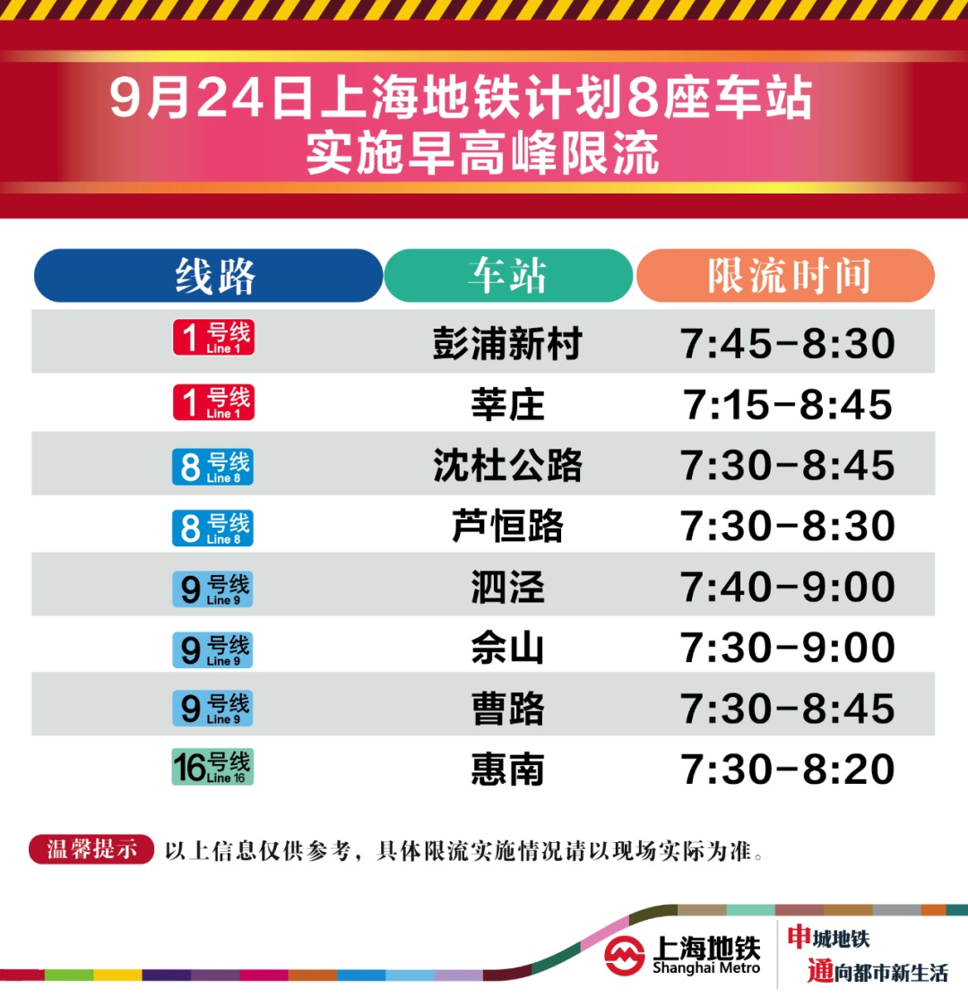 9月24日早高峰彭浦新村、佘山等8座地铁站计划限流