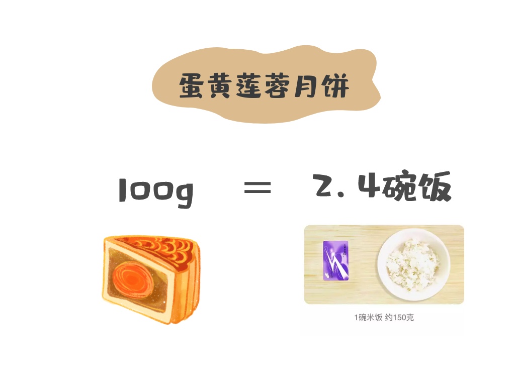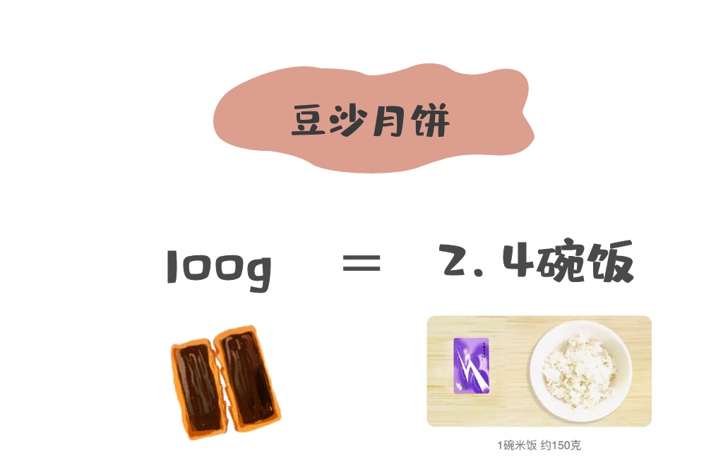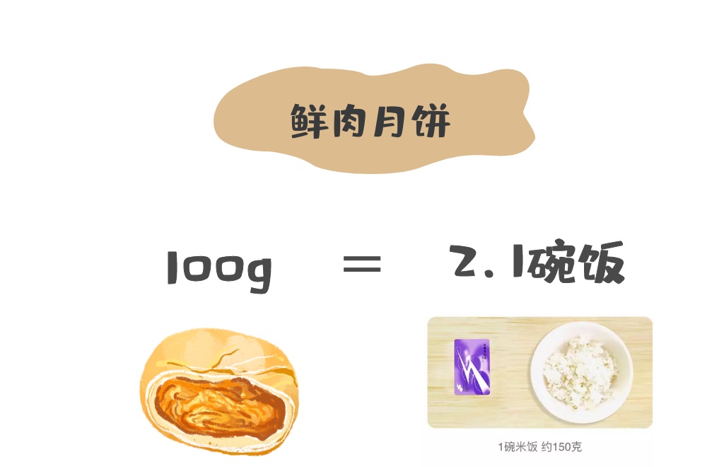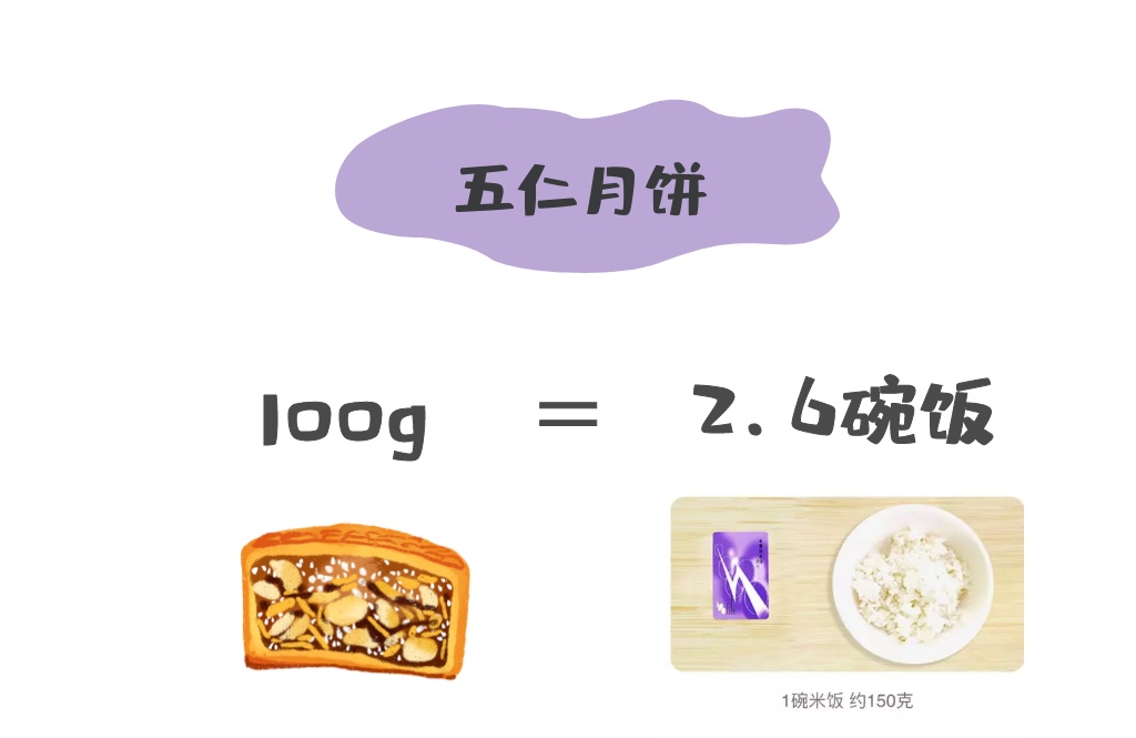 从热量上看,一个100g月饼相当于350g熟米饭(相当于7两)。其中脂肪也多为饱和脂肪。大量研究表明,饱和脂肪会增加心血管疾病风险。