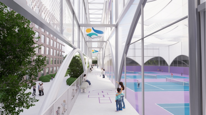 网球馆以“引力场”为核心理念,通过空间布局主动塑造校园活力极核。设计以模块化钢构架编织立体网格立面,内外景观相互渗透,形成环形活力带。中心场地覆盖张拉膜结构,呼应网球运动轨迹。清晨,学生们抱着书本穿过钢构架下的光影走廊;午后,看台台阶变成露天自习室;傍晚,社团在灰空间里筹备活动,击球声与欢笑声此起彼伏。设计遵循以人为本的理念,以新的校园建筑形式,填补校园生活个性空间,让运动场景成为视觉催化剂,融入校园生活。