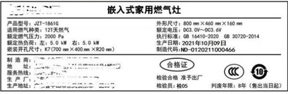 判定说明:灶具应当有中文标明的产品名称、生产企业和地址、产品执行标准、产品质量检验合格证明、判废年限等信息