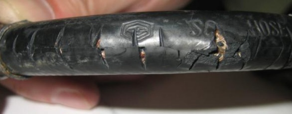典型特征:使用橡胶软管;连接软管龟裂、老化