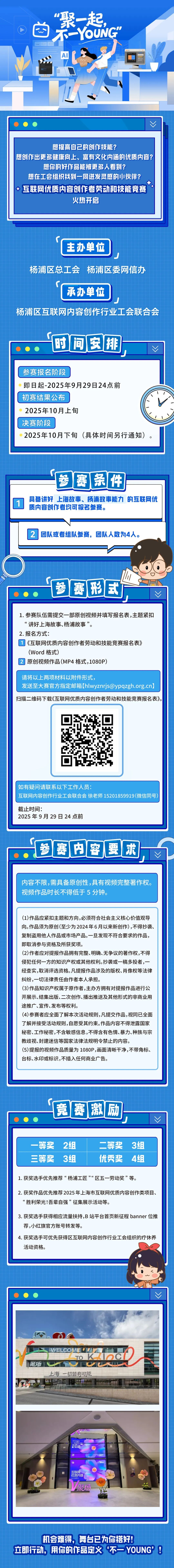 在信息奔流的时代,如何让您的创作不仅被看见,更能产生深度价值?如何将个人才华融入积极健康的网络文化,奏响新时代的主旋律?现在,一个赋能成长、展示风采的舞台已然铺就。 由杨浦区总工会、杨浦区委网信办主办,杨浦区互联网内容创作行业工会联合会承办的“互联网优质内容创作者劳动和技能竞赛”正式启动。我们诚挚邀请每一位心怀热爱的创作者,用镜头记录美好,用文字传递思想,用创意点亮网络空间。 赛事报名通道现已开启,截至2025年9月29日。经过初赛遴选,优秀选手将于10月下旬会师决赛。最终的优胜者将获得丰富激励。 资料 | 区总工会 编辑 | 文茜婷 *转载请注明来自上海杨浦官方微信 (点击图片查看)