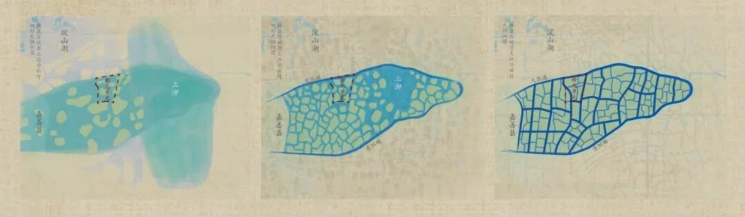 新元单元位于湖荡平原和湖积平原的交汇处,兼有两者地理特点。历史上该区域最早为低地沼泽,水域面积广阔。唐之后,圩田兴起,湖荡沼泽不断缩小,先民向湖争田,造就了江南“天下粮仓”的美誉。在《吴中水利全书》中,我们可以一览新元单元在当时的空间结构。宋之后,圩田技术逐渐进入全盛期,出现联圩治水,抵御旱涝水患,排灌体系不断细化,整体水网形成“五里、七里为一纵浦,七里或十里为一横塘”的“塘浦制”,奠定了新元单元现在的整体棋盘水网格局。
