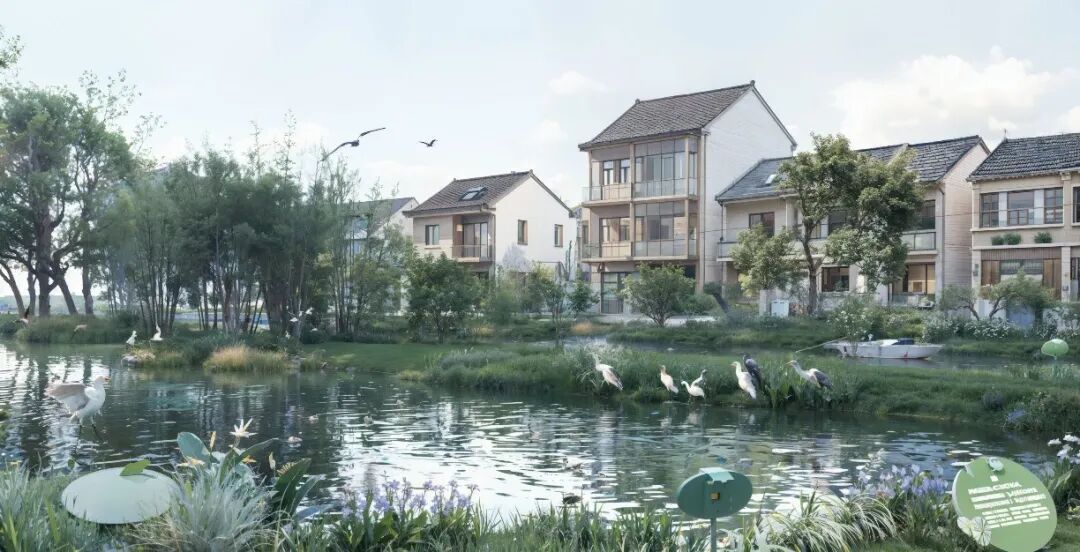 沿水环北侧的南长浜市河串联多种湿地类型,形成水上泛舟、岛中漫步、屋下小憩的三重体验。贯穿“外田-村宅-泾浜-塘岛-内田”五重界面,呈现“田包村、村包田”新元特色。溯水而行,聚落中有随处可见的院角苦楝、河道里有睡莲浮沉、岸边有美人蕉摇曳、荷塘鱼塘里的水八仙更有藏不住的蛙鸣鸟语。