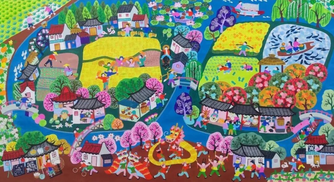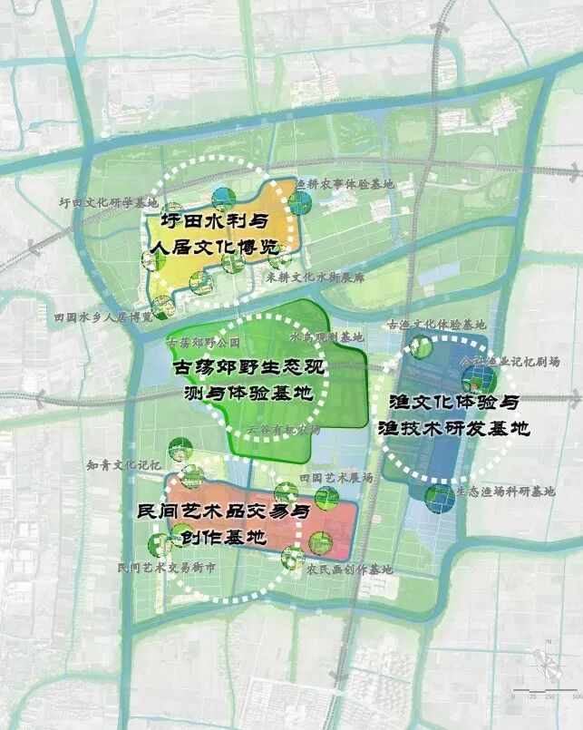 融合文化要素,传承农耕、民俗、非遗等文化特质,将单元结构赋予文化主题,打造体验丰富的文化体验组团,彰显风貌特色。北部的新元圩赋予“新元满满·田间农事”主题,通过完整保留“水田相生”的原始肌理,强化水田关系基底,彰显农耕原乡风情。南部的中洪圩是金山农民画的起源地,赋予“荷影荡荡·画中雅事”主题,以金山农民画为主脉,以诗书画陶当地文化为支点,将文化艺术场景融入水乡基底,凸显乡村艺术和乡村生活的结合。东部的杨进浜圩赋予“渔舟唱晚·渔家乐事”主题,将历史上“白牛古荡”渔猎文化和现代绿色养殖相结合,体验沪派渔家生活乐事。中部低塘野荡,以湿地风光和大片农田肌理为主要特色,通过千亩稻浪与鹭鸟栖息的场景,再现江南野趣。