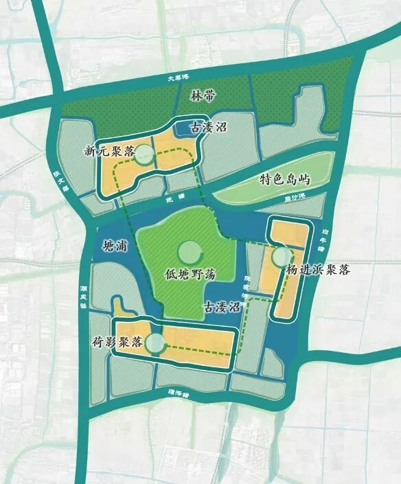 从新元单元与枫泾古镇紧密依存的区域整体格局出发,构建“北圩村”“南古镇”整体联动的“两重意境”“一轴双环”结构格局。在整体格局下,新元单元依循原生空间肌理,以横塘纵浦、棋盘水网为骨架,以“水田村”耦合的村居聚落为核心,以塘、湿、林、草等自然生境为底板,围绕“联圩遗村留古韵,古荡飞鹭绘美景”的“千年圩田·画境水乡”总体定位,构建“塘浦联圩”绘水韵、“三重聚落”三画卷、“低塘野荡”成绿景的单元空间结构。