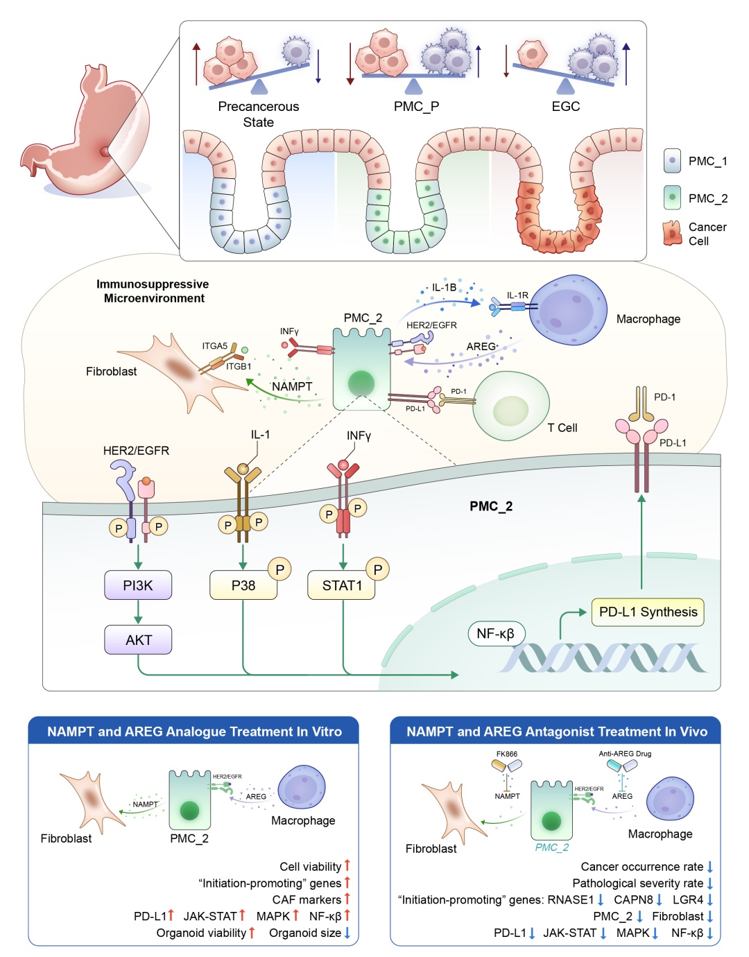研究团队成功鉴定出一个位于肿瘤前缘的关键临界区域——PMC_P,该区域富含一类具有干性和炎症特征的胃小凹黏液细胞(PMC_2)。这些细胞通过NAMPT–ITGA5/ITGB1轴与成纤维细胞互作,并通过AREG–EGFR/ERBB2轴与巨噬细胞通信,共同激活JAK-STAT、MAPK和NF-κB等致癌通路,促进免疫抑制微环境形成(如PD-L1上调),从而驱动EGC的起始。