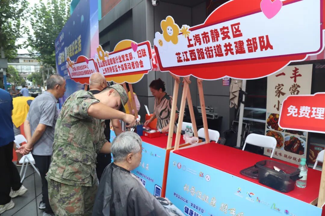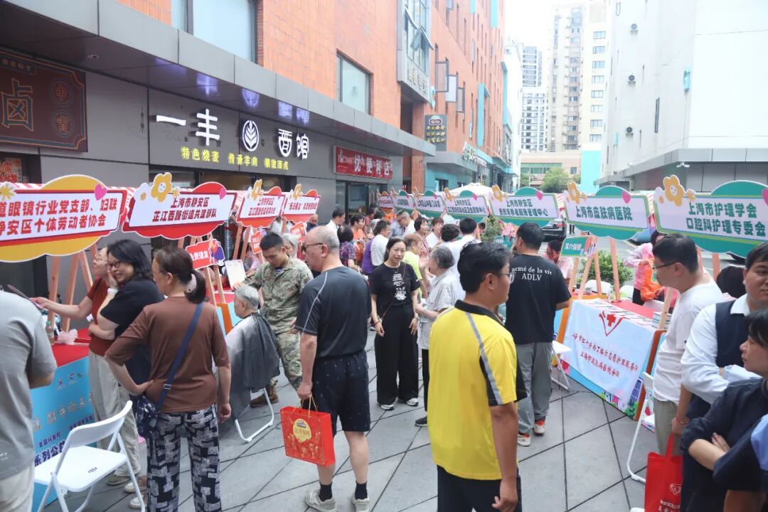 活动现场,“静新益家”社会组织志愿服务队及成员单位早已布置好多个服务点位。大篷车旁渐渐排起了长队,人气颇旺。来自周边楼宇的白领、穿梭于城市之间的外卖骑手、附近社区的居民纷纷驻足,在各个服务点前咨询、体验。