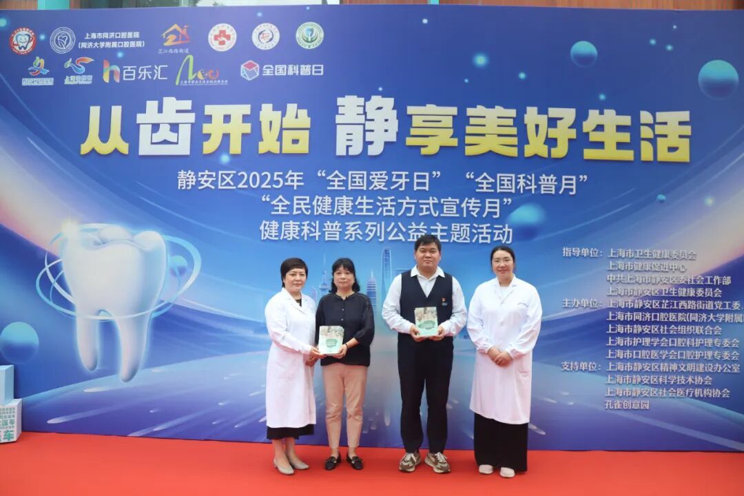 活动中,同济大学附属口腔医院向新就业群体代表赠送了护牙礼包,推动优质口腔医疗资源真正惠及基层群众。上海市护理学会口腔科护理专委会分别向街道老年协会、街道未成年人保护工作站“一老一小”代表赠送了《全生命周期口腔健康养护》科普书,全方位守护市民口腔健康。