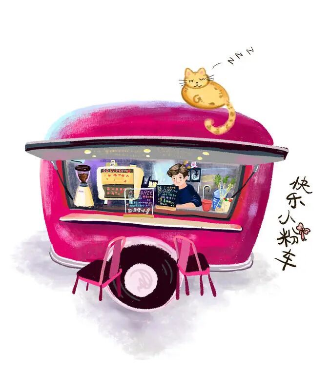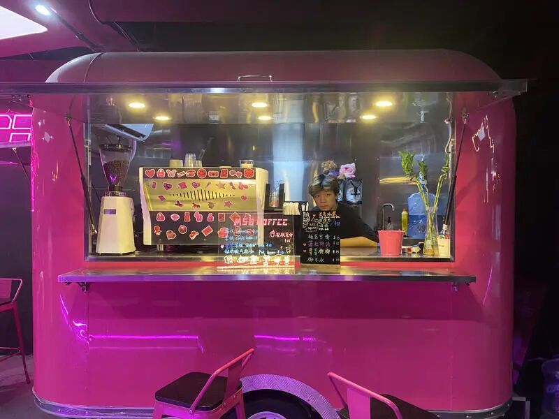 芭比粉的小车用它鲜艳的色彩向各位食客们“宣告”,“夜猫子”们该出来活动了!