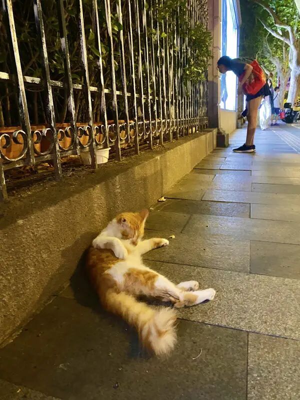 梧桐树下慵懒且毫不畏惧路人的大橘,教你怎么享受生活,勿要紧张不安,淡定是与生俱来的猫生态度。