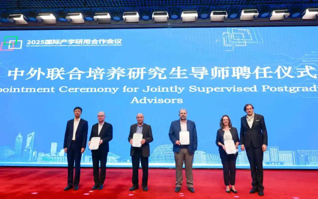 瑞士工程院院长、上海大学中瑞先进技术研究院院长贝努瓦·杜比(Benoît Dubuis)院士与上海大学吴坚勇书记为瑞士工程院院士、瑞士意大利语区大学校长莫妮卡·杜卡·维德默(Monica Duca Widmer)女士,瑞士工程院院士、瑞士电子与微技术中心副主任阿兰-塞尔日·波雷特(Alain-Serge Porret)先生,瑞士工程院院士、苏黎世联邦理工学院教授马丁·富塞内格尔(Martin Fussenegger)先生以及瑞士日内瓦高等专业应用科学大学教授吕克·斯托皮尼(Luc Stoppini)先生共同颁发中外联合培养研究生导师聘书。