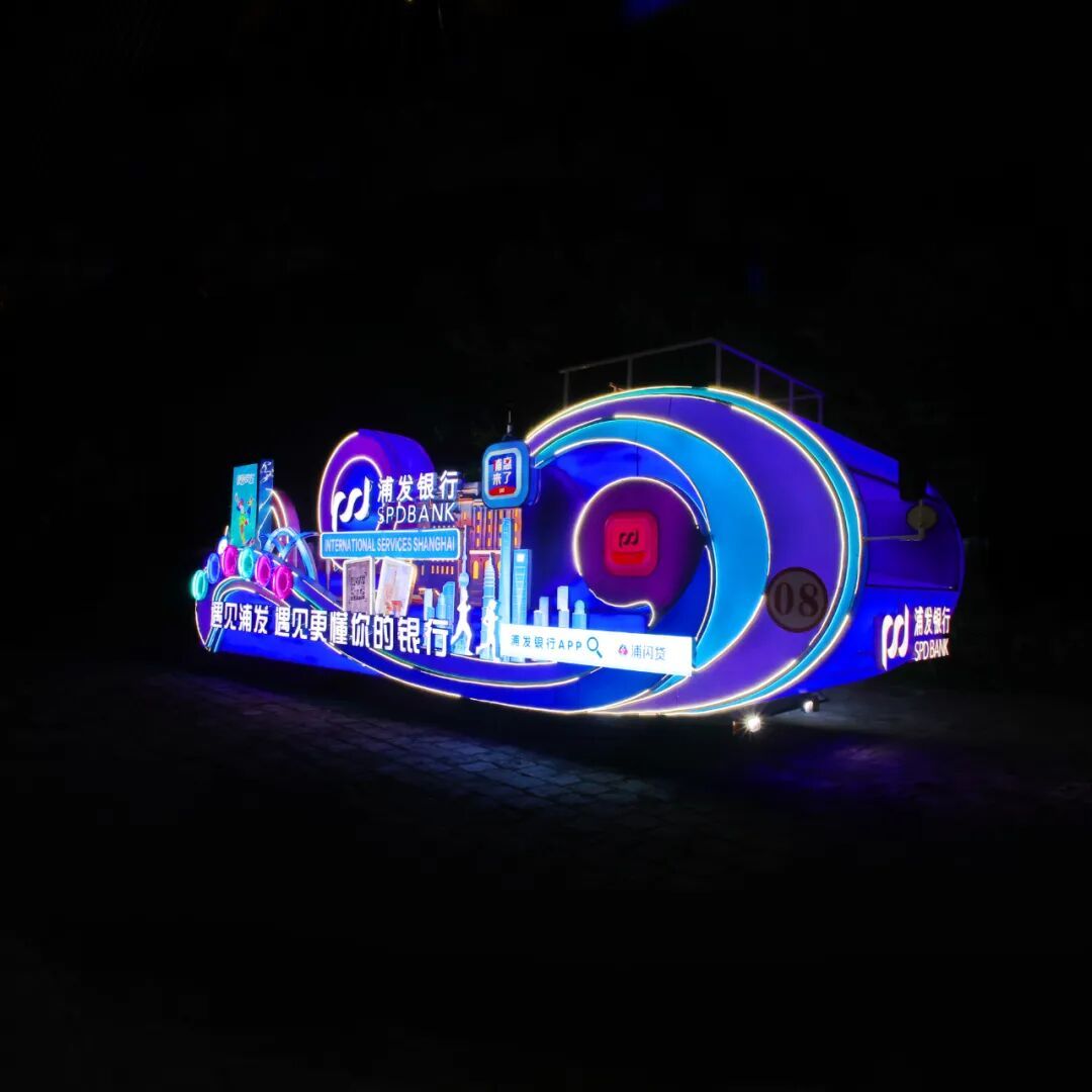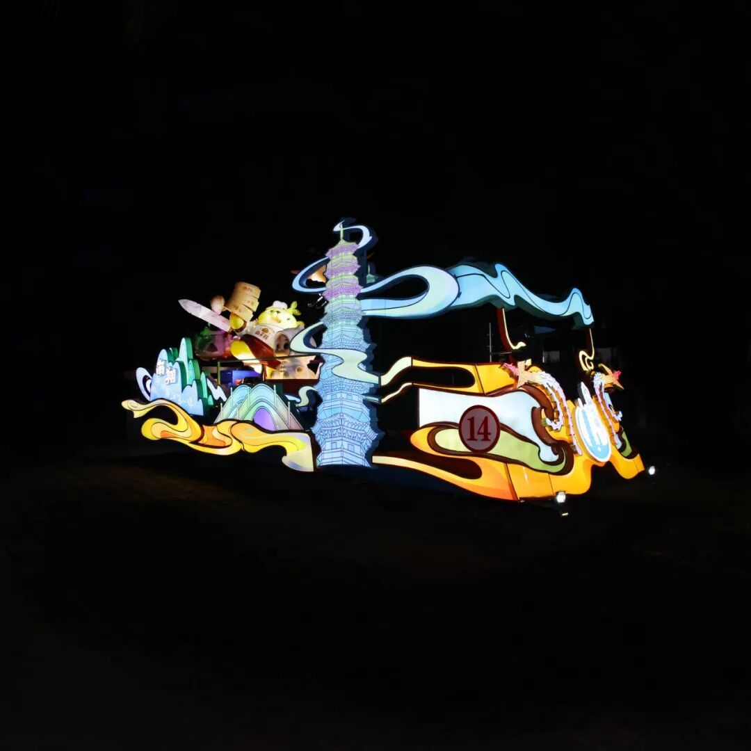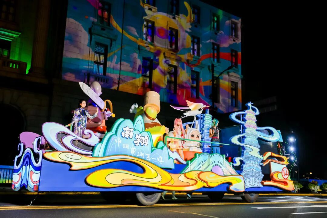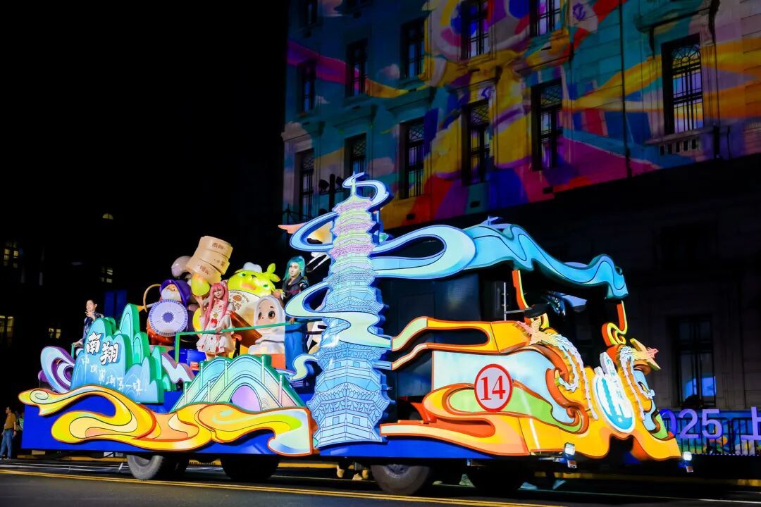 南翔的「中国国潮第一镇」炫彩花车仿佛一座“国潮万花筒”。车首,千年双塔与翩然仙鹤相映成趣,祥云缭绕间,“小笼包宝宝”俏皮探头,车身汇聚了南翔本土顶流IP阵容。