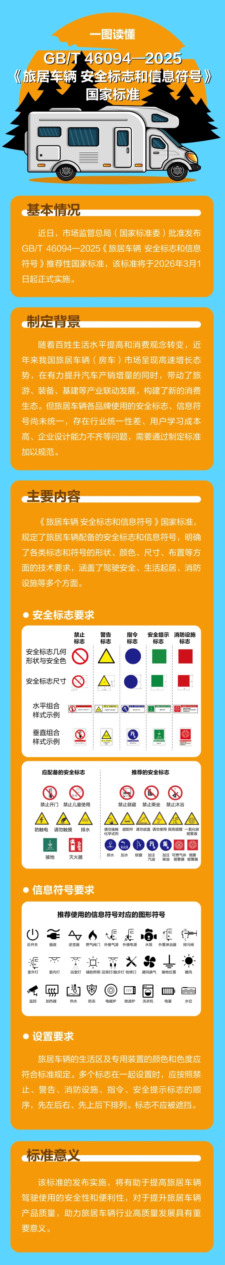 近日,市场监管总局(国家标准委)批准发布《旅居车辆 安全标志和信息符号》(GB/T 46094—2025)推荐性国家标准,该标准将于2026年3月1日起正式实施。来看市市场监管局带来的“一图读懂”↓ 随着百姓生活水平提高和消费观念转变,近年来我国旅居车辆(俗称房车)市场呈现高速增长态势,在有力提升汽车产销增量的同时,带动了旅游、装备、基建等产业联动发展,构建了新的消费生态。 为规范旅居车辆设计、生产和使用,市场监管总局(国家标准委)组织制定了《旅居车辆 安全标志和信息符号》(GB/T 46094—2025)国家标准,规定了旅居车辆配备的安全标志和信息符号,明确了各类标志和符号的形状、颜色、尺寸、布置等方面的技术要求,涵盖驾驶安全、生活起居、消防设施等多个方面。该标准要求旅居车辆在关键区域张贴醒目提示标志,用直观方式帮助使用者规避风险,例如,在床铺旁设置“禁止在行车过程中就寝”标志、在卫生间门口设置“行车过程中请勿沐浴”标志等,提醒使用者避免危险行为,通过直观提示帮助更多人快速掌握旅居车辆使用规范,增强车辆安全使用意识,让每一次“移动小家”的出行,都能在安全护航下更安心、更舒心。 该标准的发布实施,将有助于提高旅居车辆驾驶使用的安全性和便利性,对于提升旅居车辆产品质量,助力旅居车辆行业高质量发展具有重要意义。 编辑:罗时珎 转载请注明来自上海徐汇官方账号