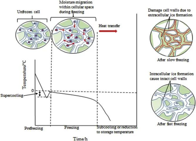 冷冻时水分迁移的过程示意图,右边两张小图分别是慢速冻结和快速冻结时形成冰晶对细胞的破坏。(图源:参考资料[1])